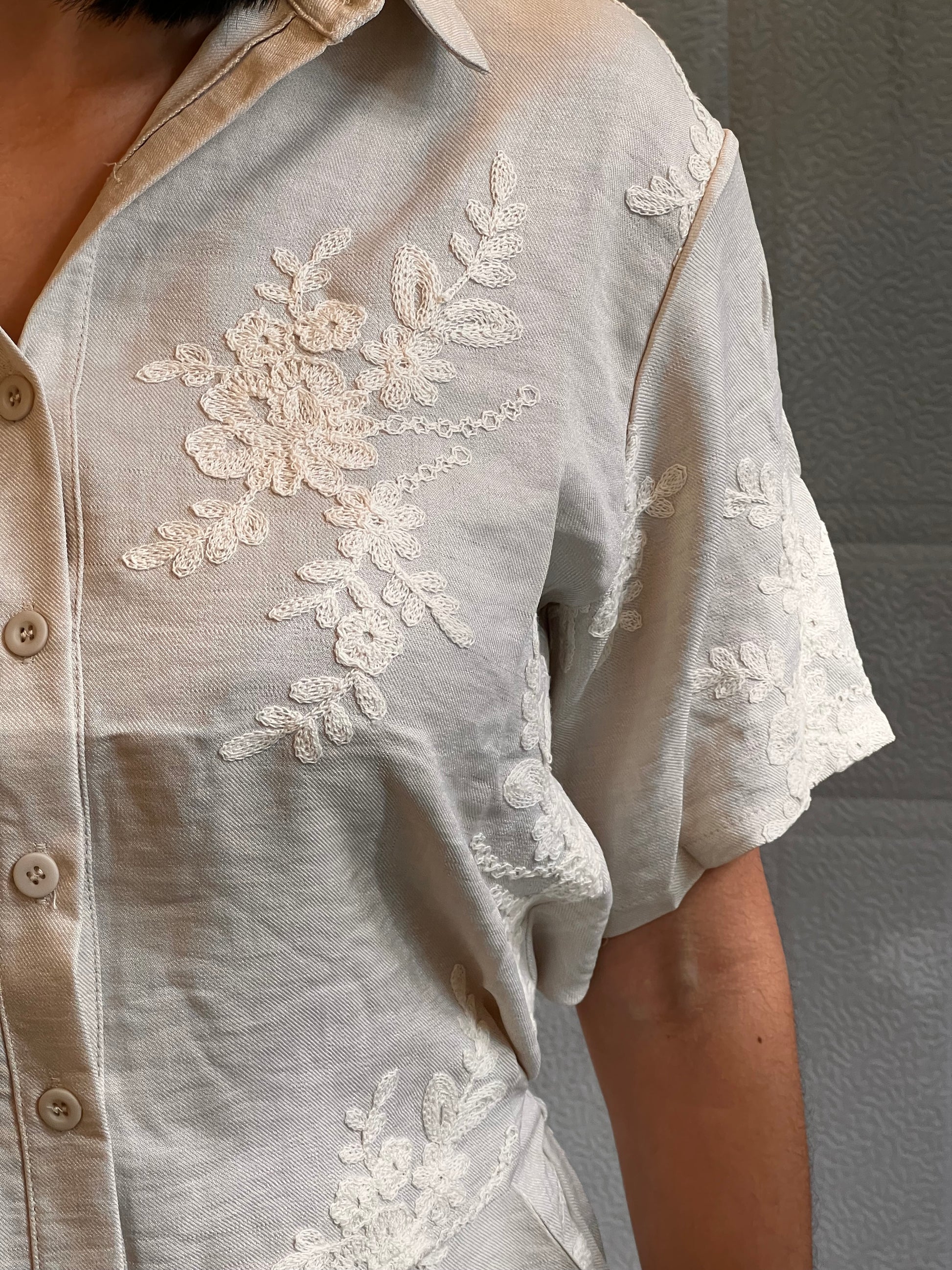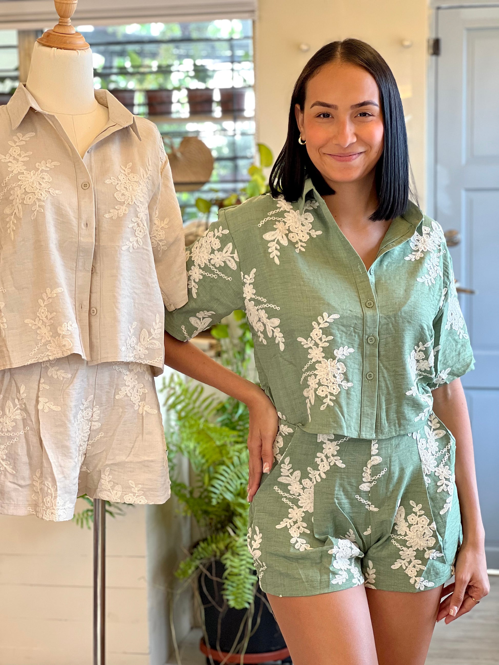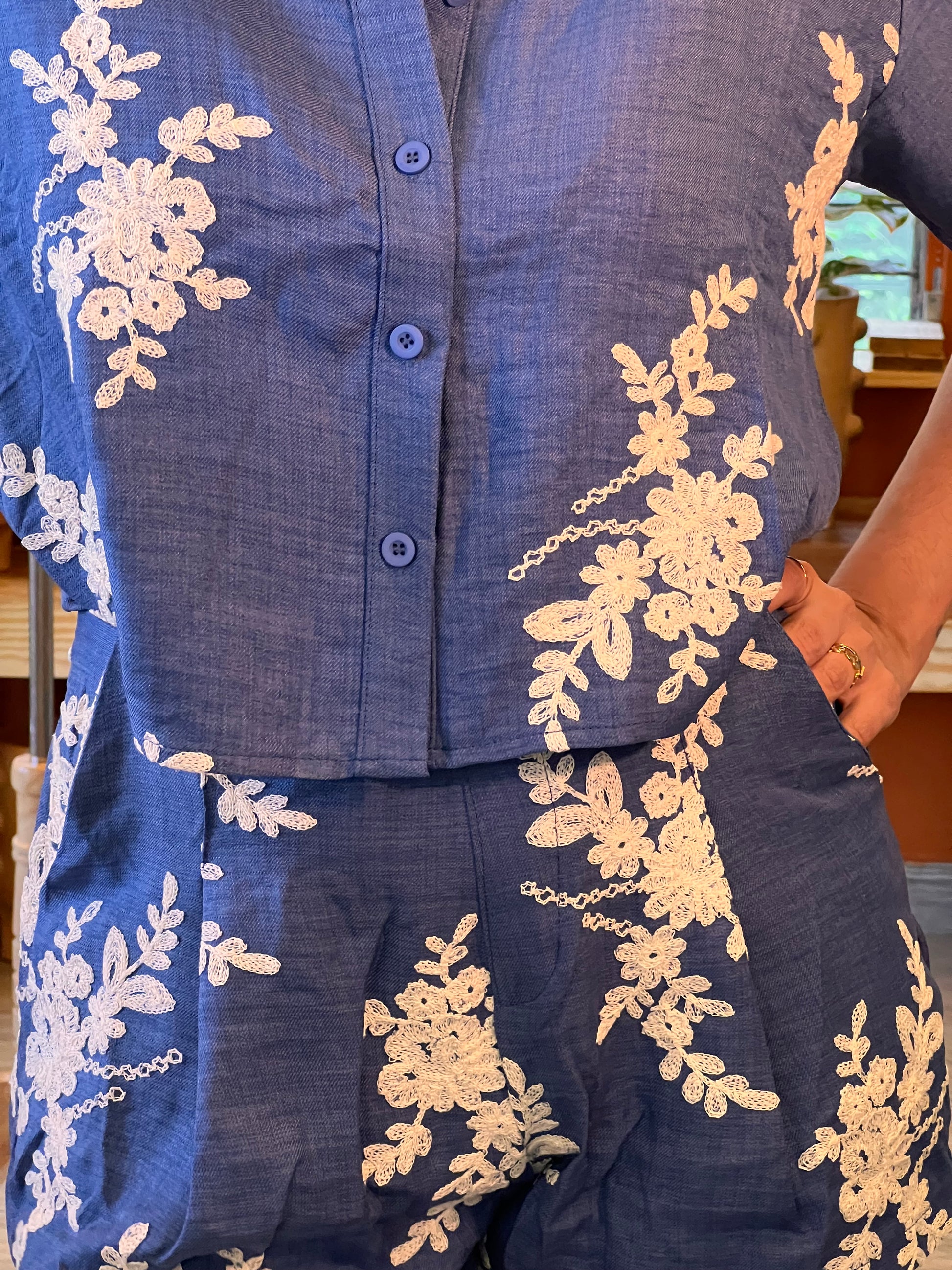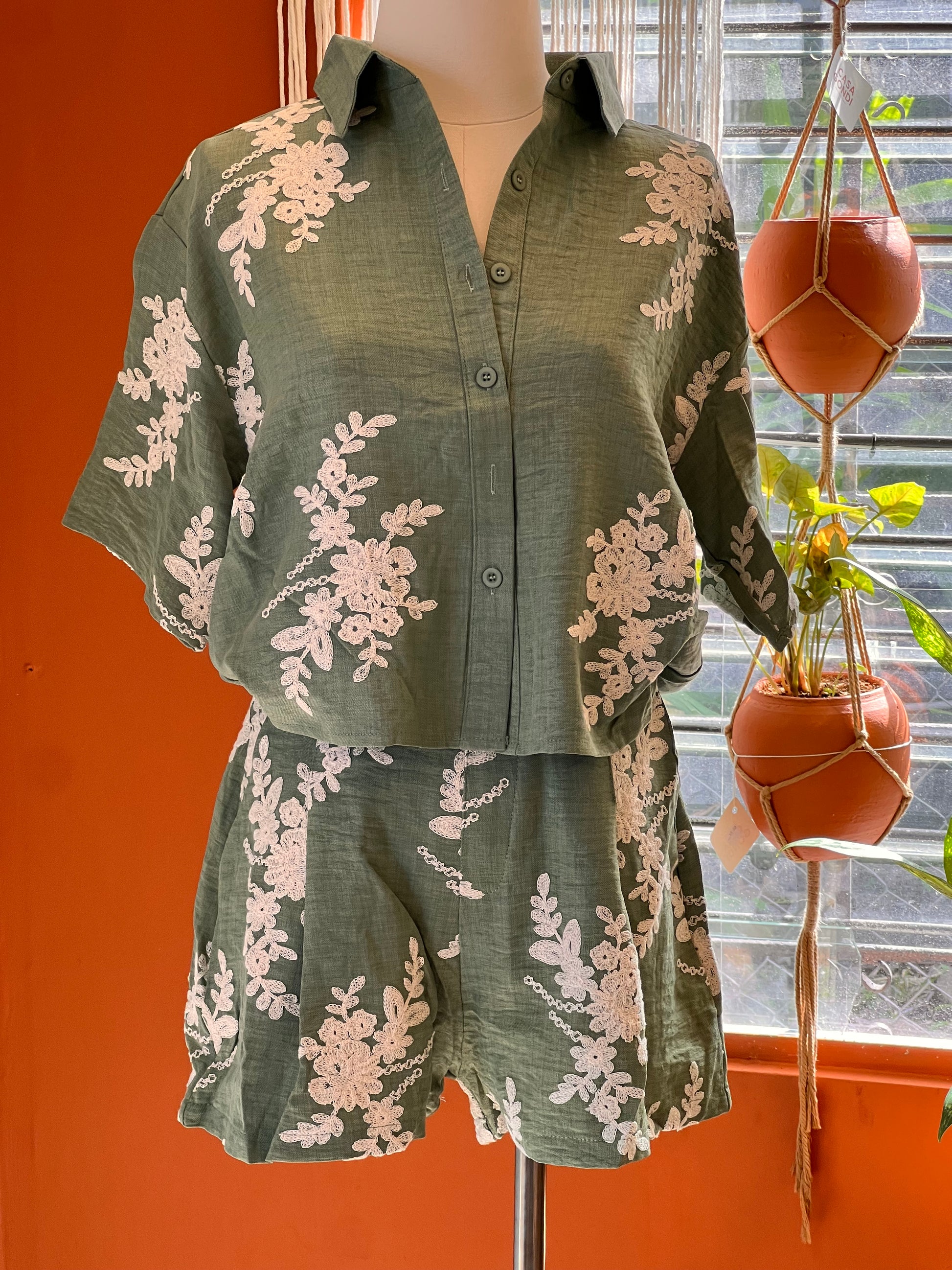 Un conjunto fresco, elegante y versátil confeccionado en lino ligero, ideal para climas cálidos. Su diseño resalta con delicados bordados florales en relieve, que aportan un toque artesanal y sofisticado.