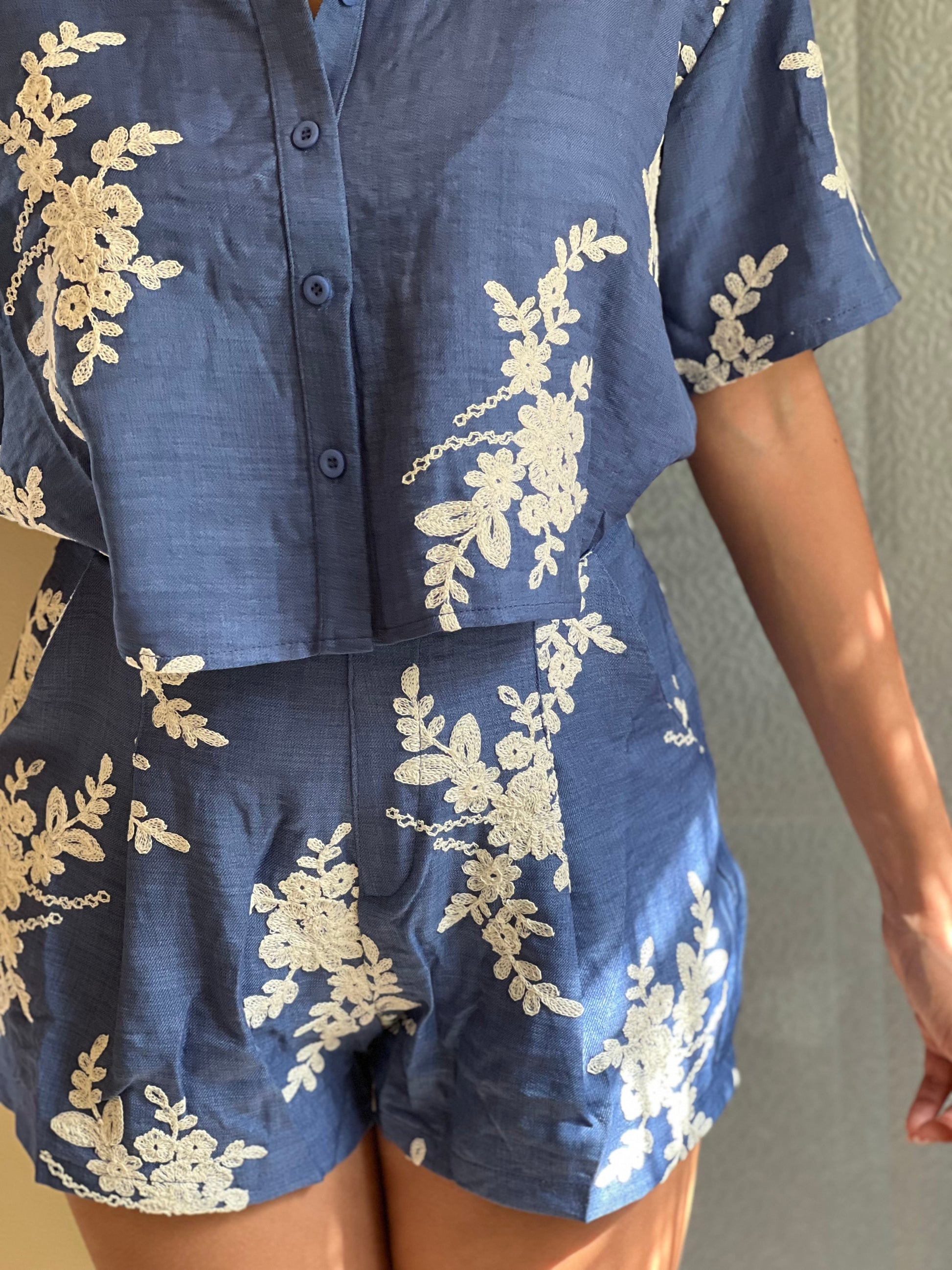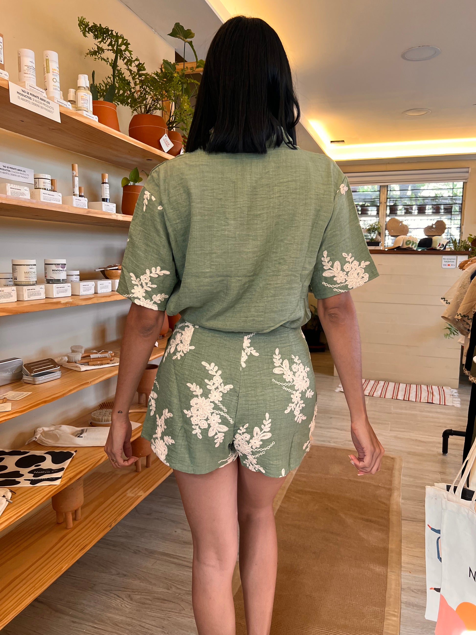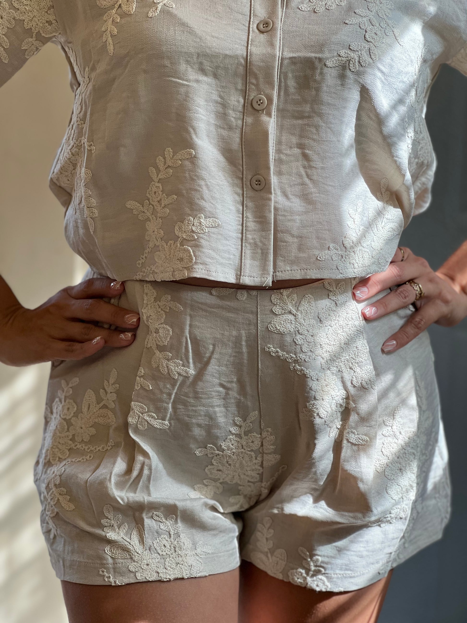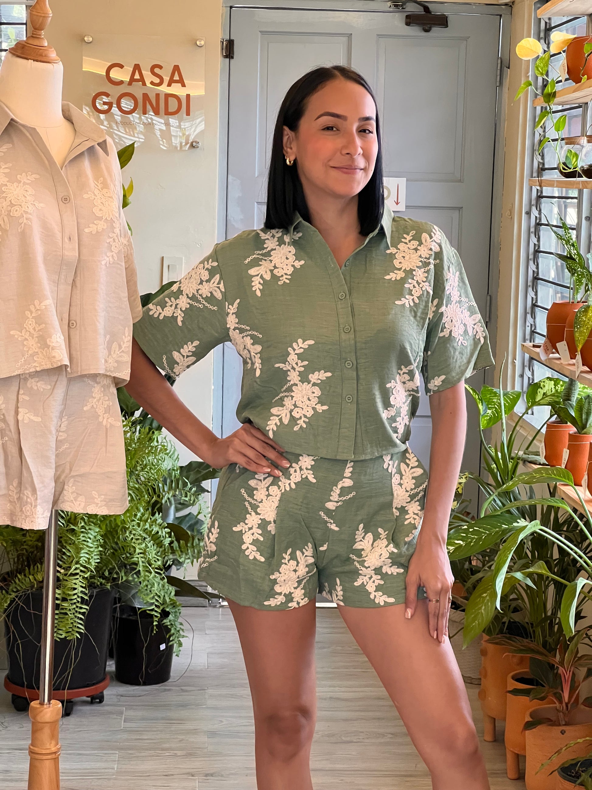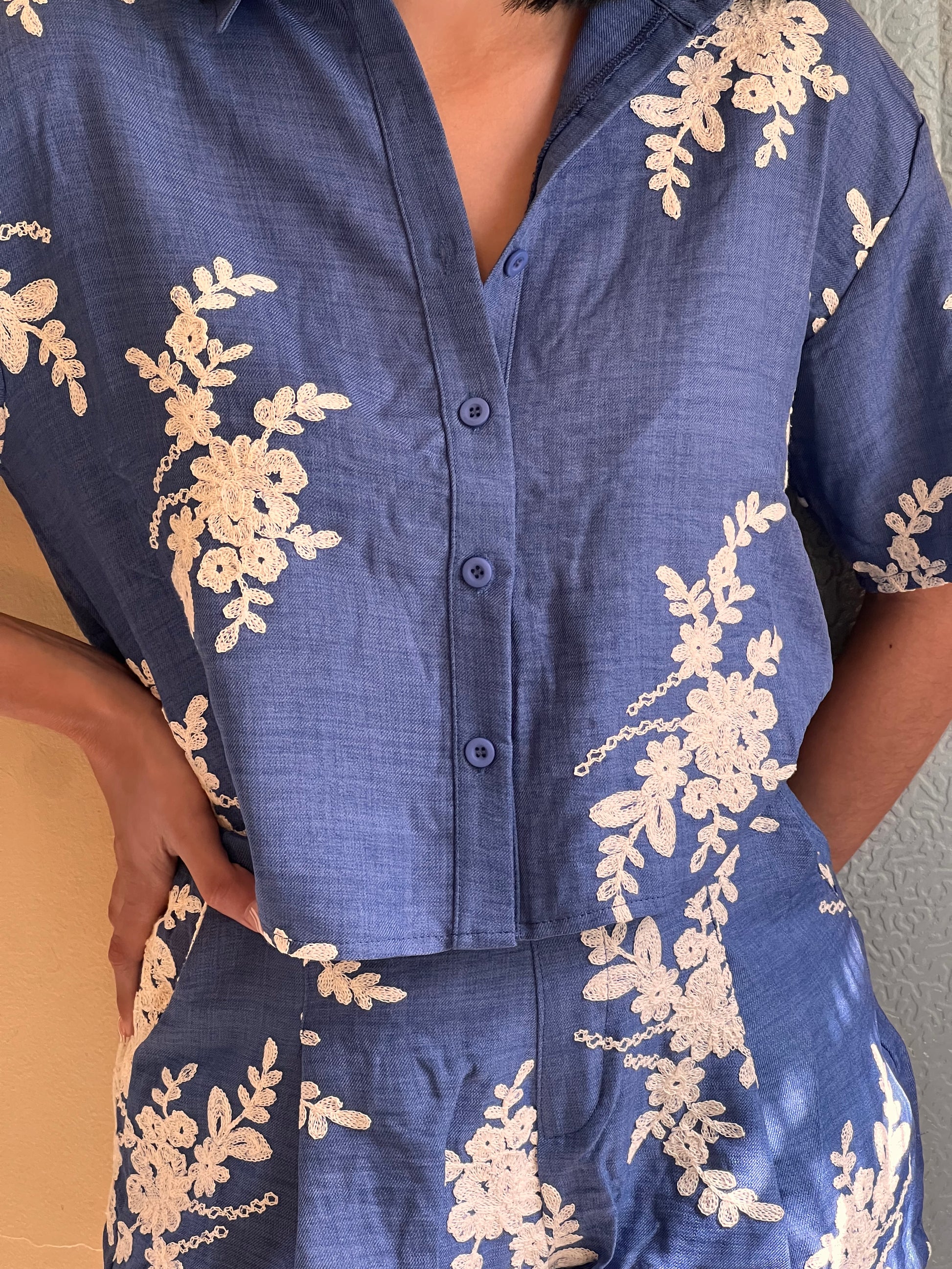 El set incluye camisa de manga corta con botones al frente y short de cintura alta, ambos con caída natural y detalles bordados que realzan su estilo. Perfecto para usar de día o de noche, tanto en salidas casuales como en eventos relajados.