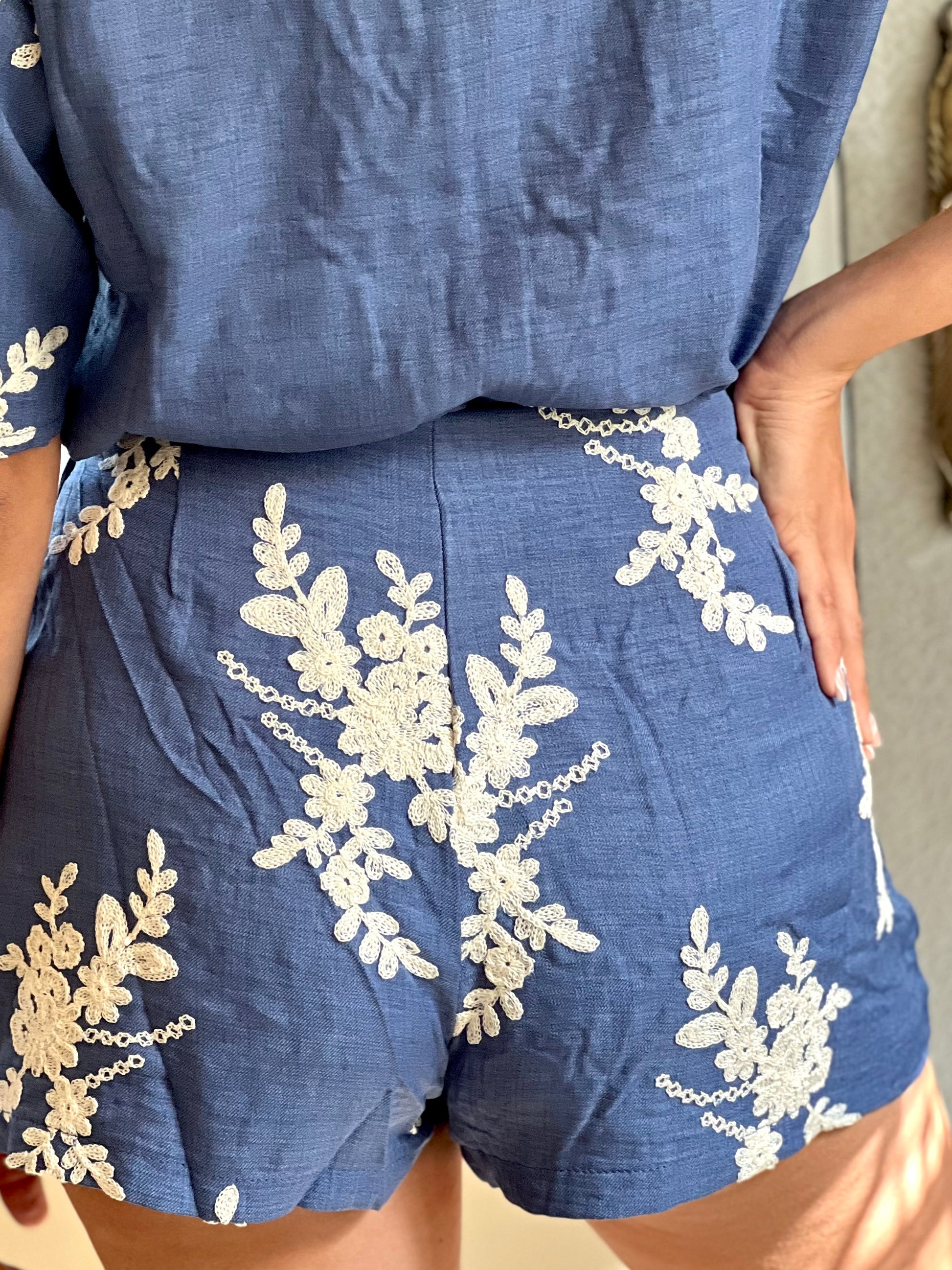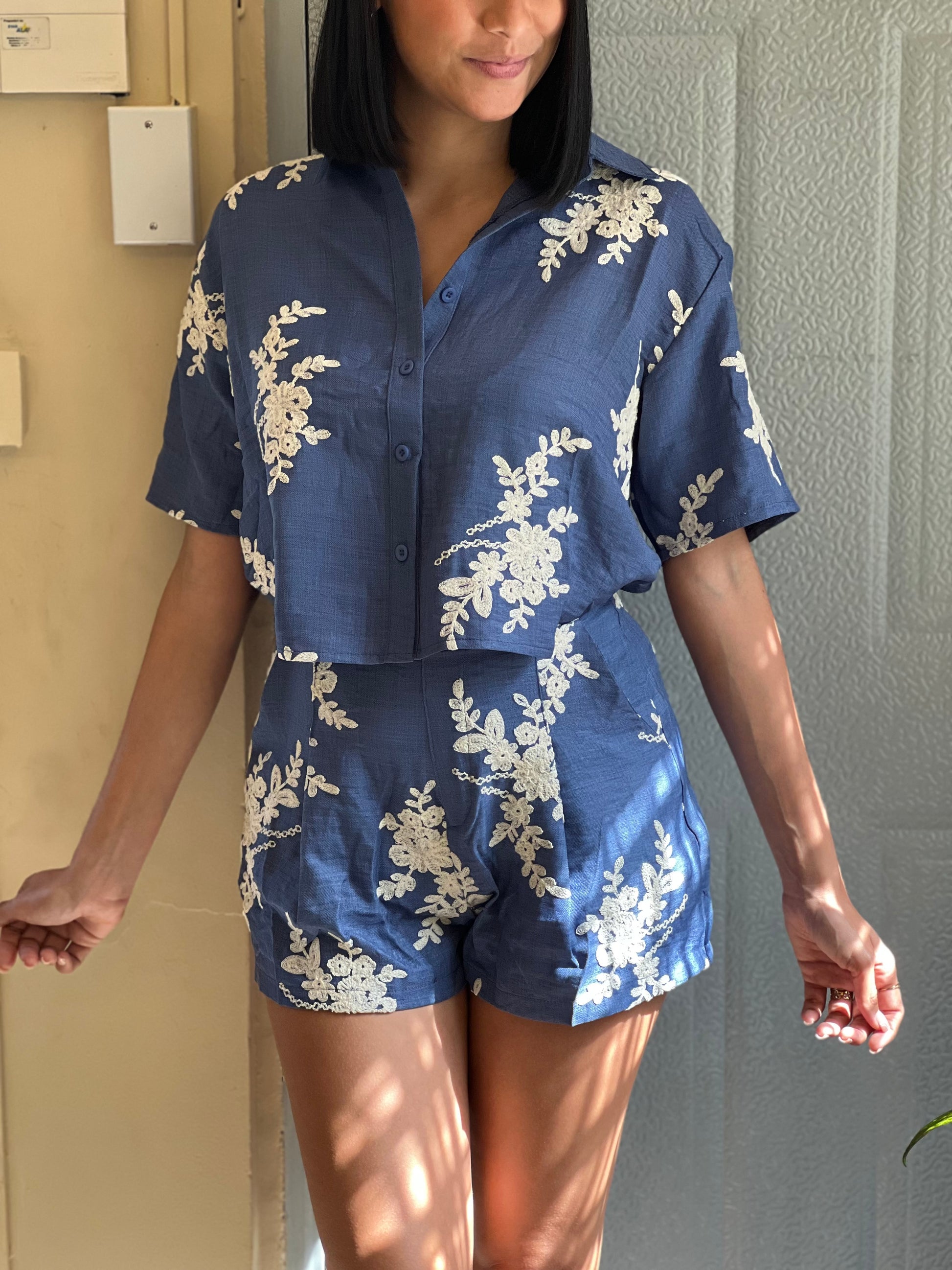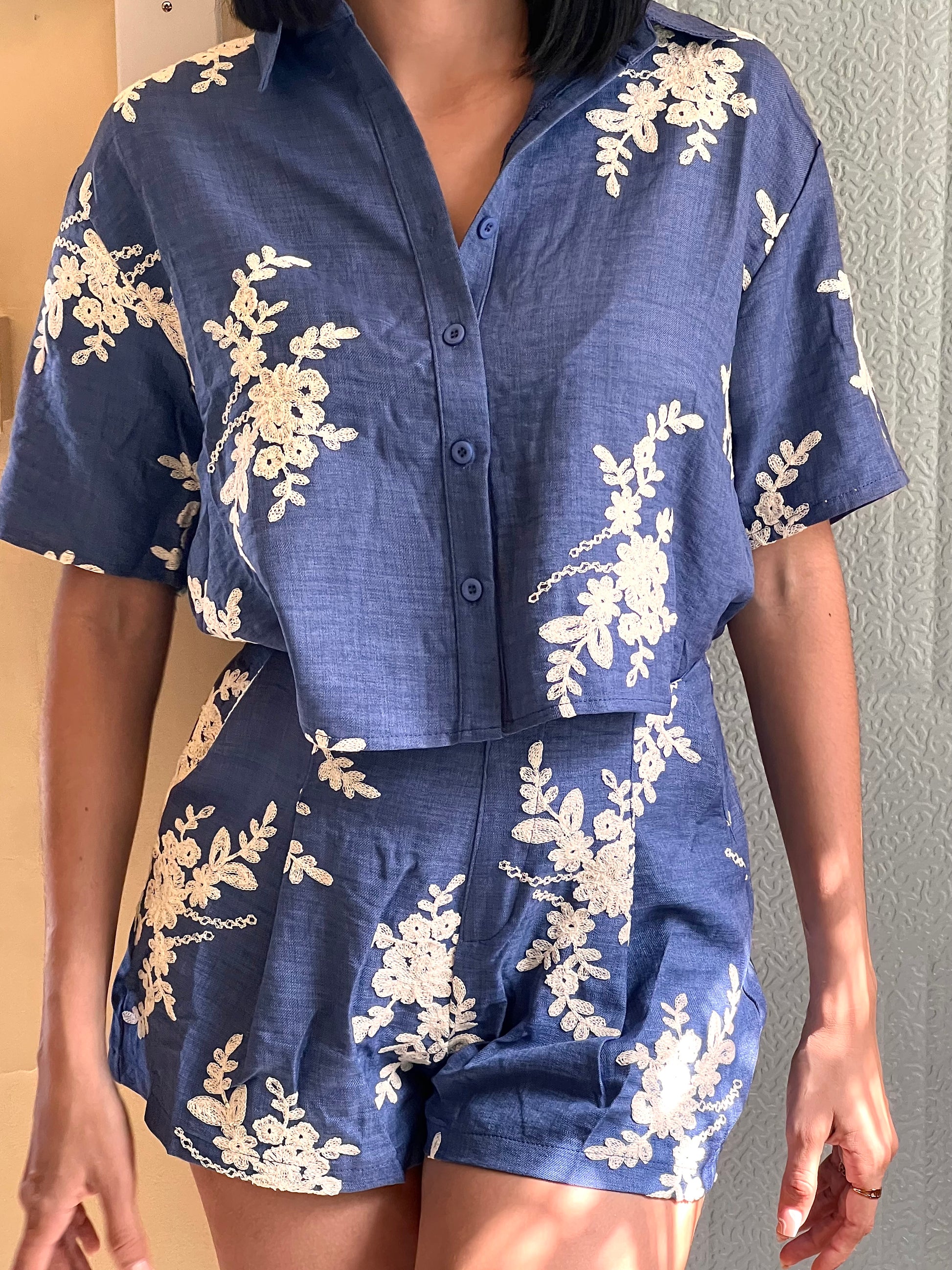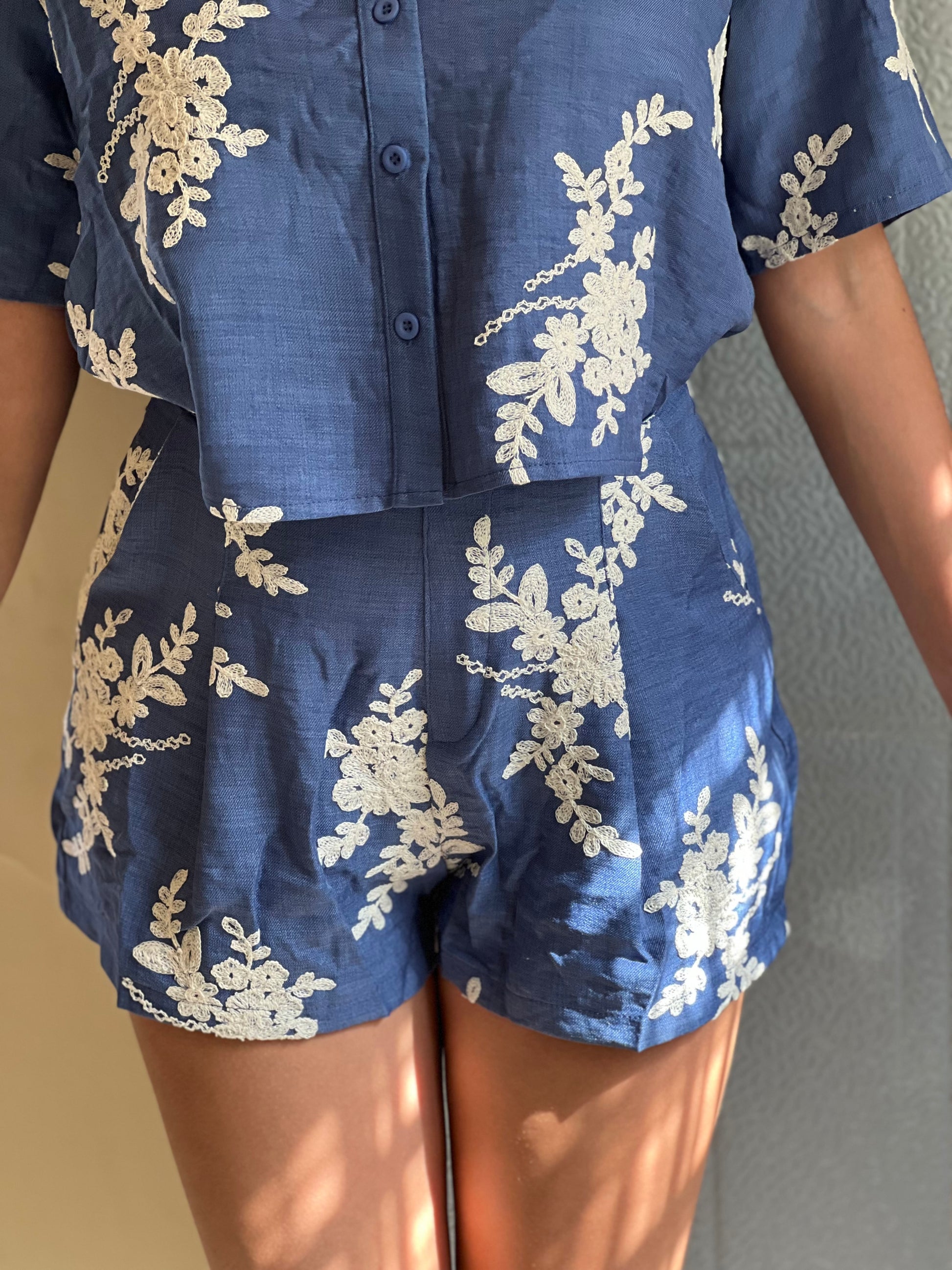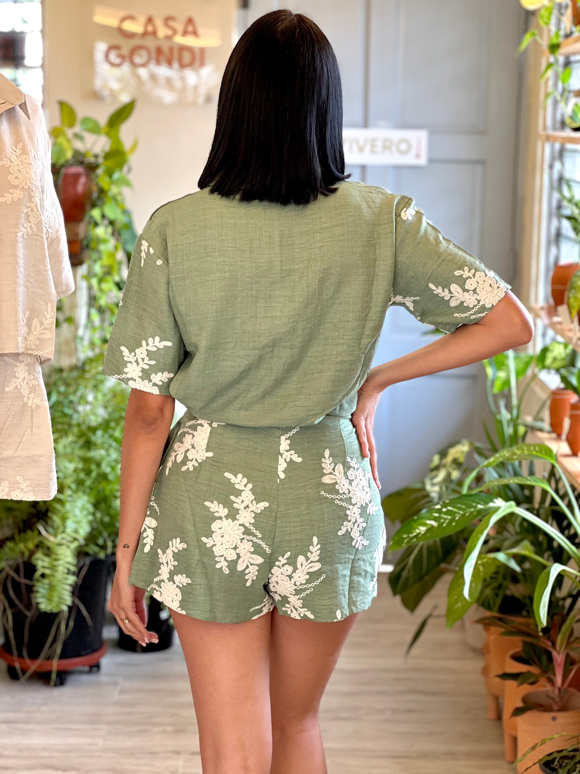 El set incluye camisa de manga corta con botones al frente y short de cintura alta, ambos con caída natural y detalles bordados que realzan su estilo. Perfecto para usar de día o de noche, tanto en salidas casuales como en eventos relajados.