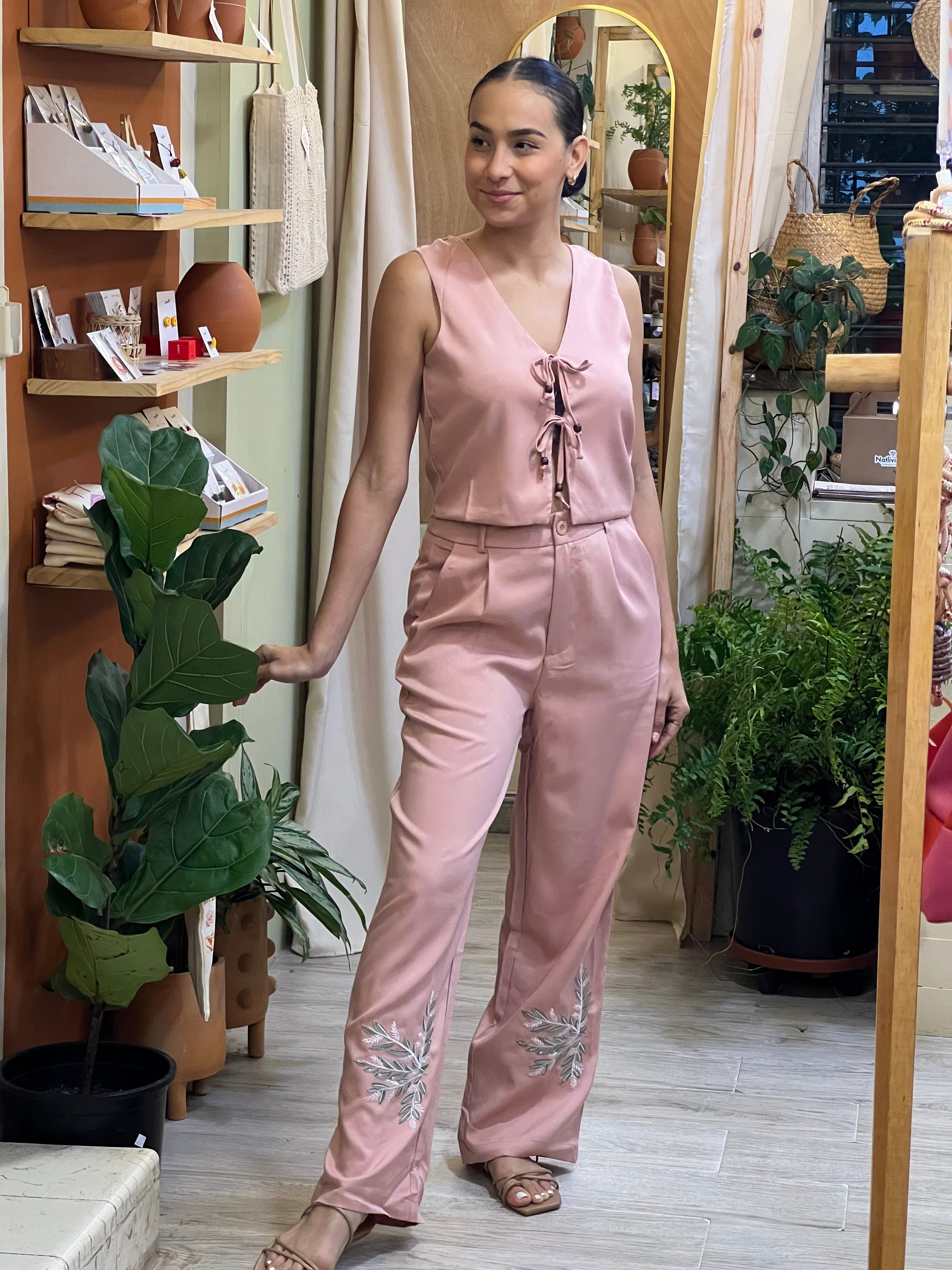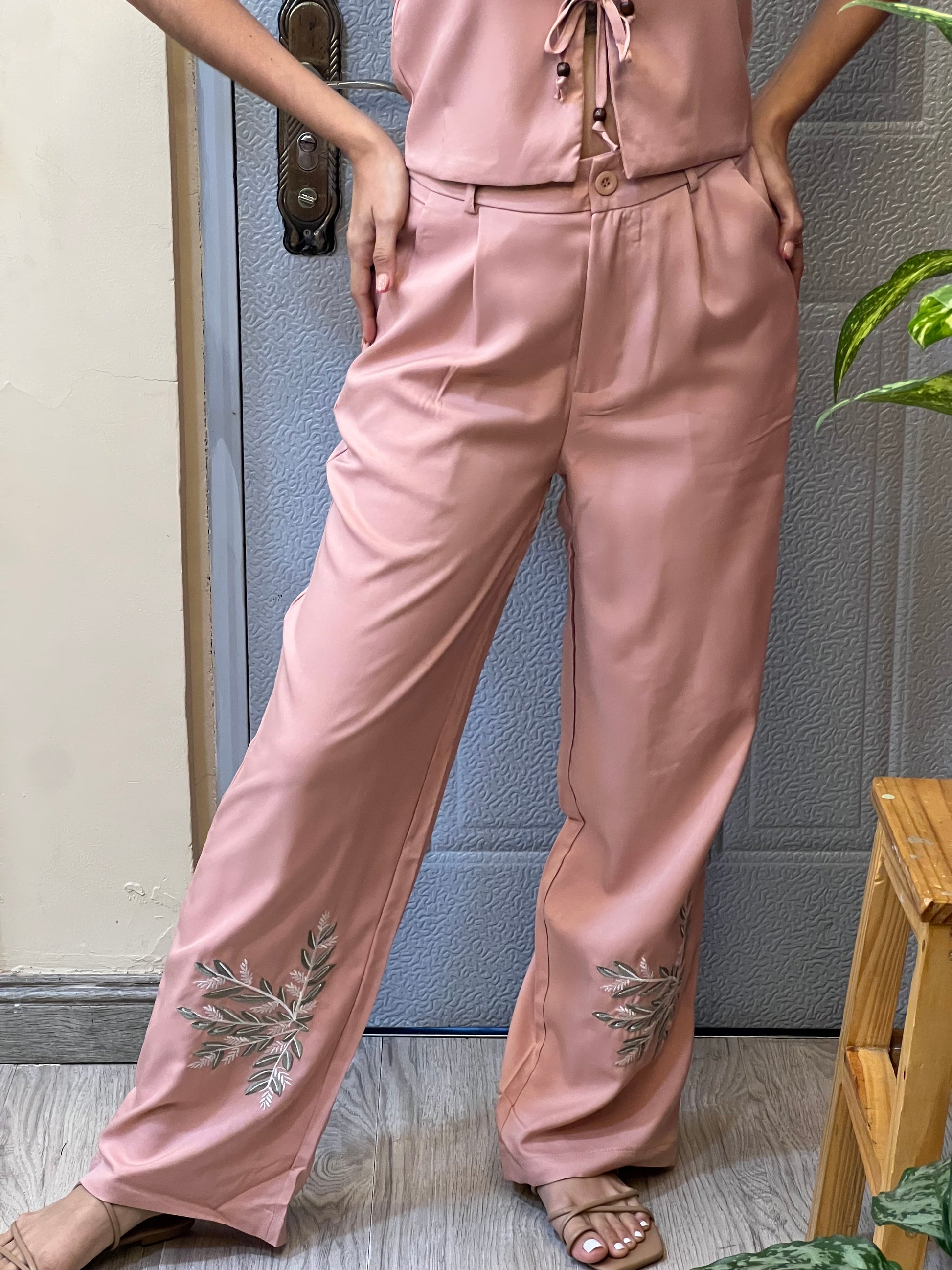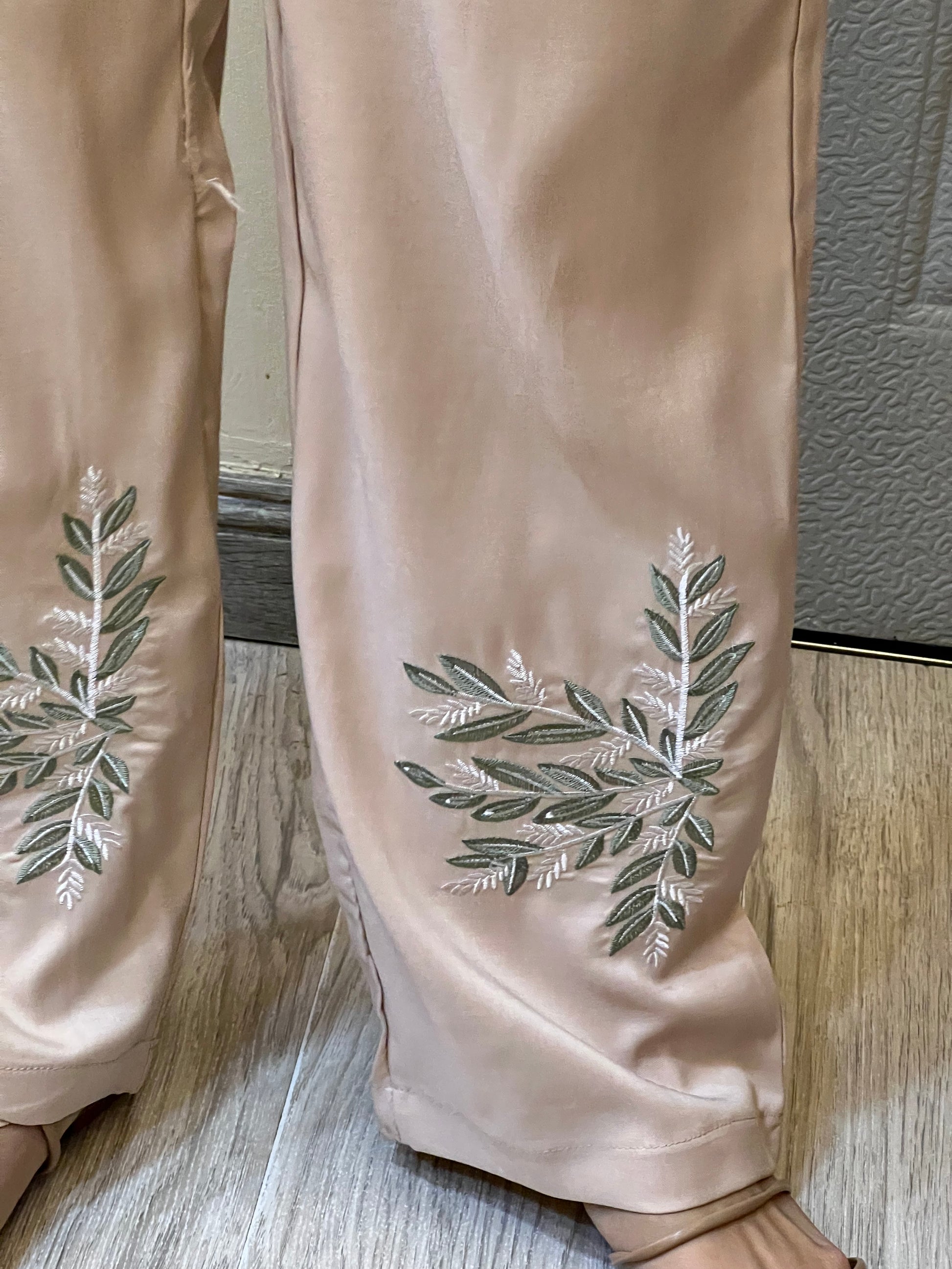 Este conjunto de dos piezas está diseñado para quienes buscan un look elegante pero cómodo. Confeccionado en tela satinada de caída ligera, aporta frescura y brillo sutil, mientras que los bordados en la parte baja del pantalón añaden un toque artesanal y delicado que lo hace único.