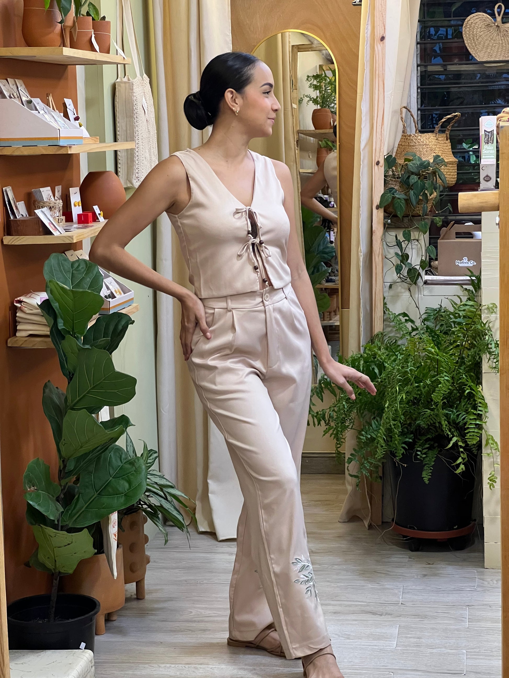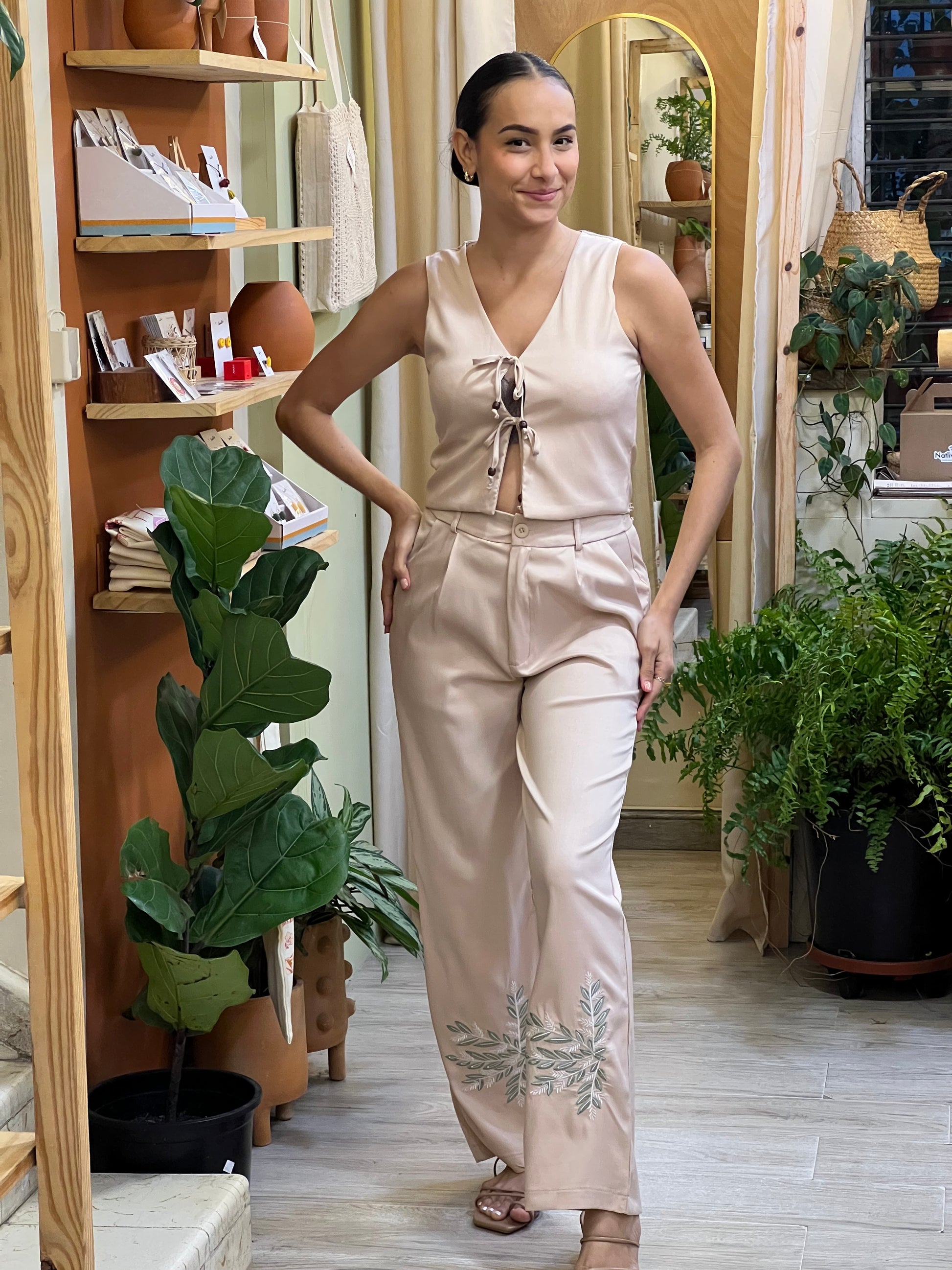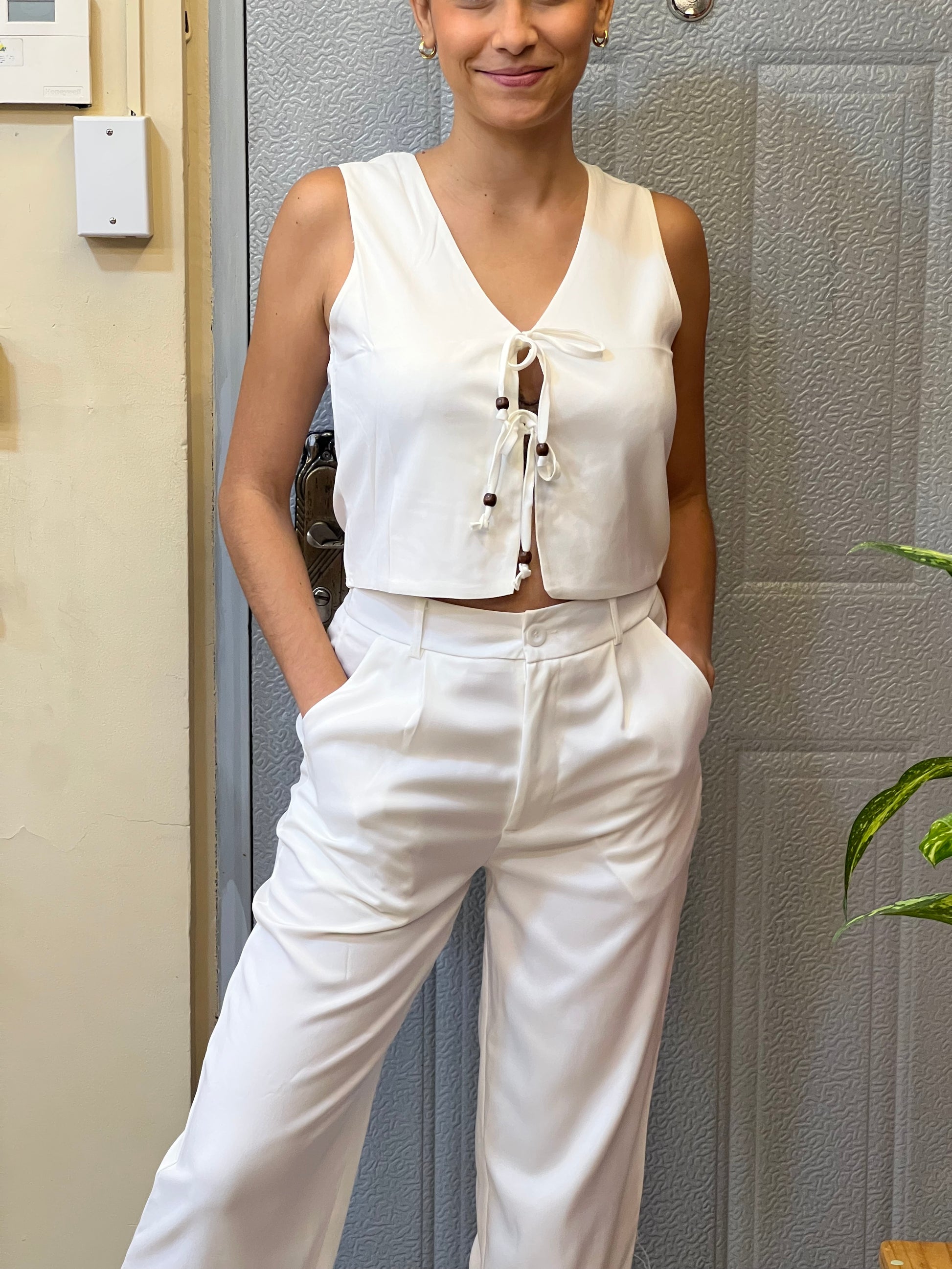 El top sin mangas con detalle de lazo frontal realza la silueta con un estilo moderno y femenino, combinando perfectamente con el pantalón de corte recto que estiliza y alarga la figura.