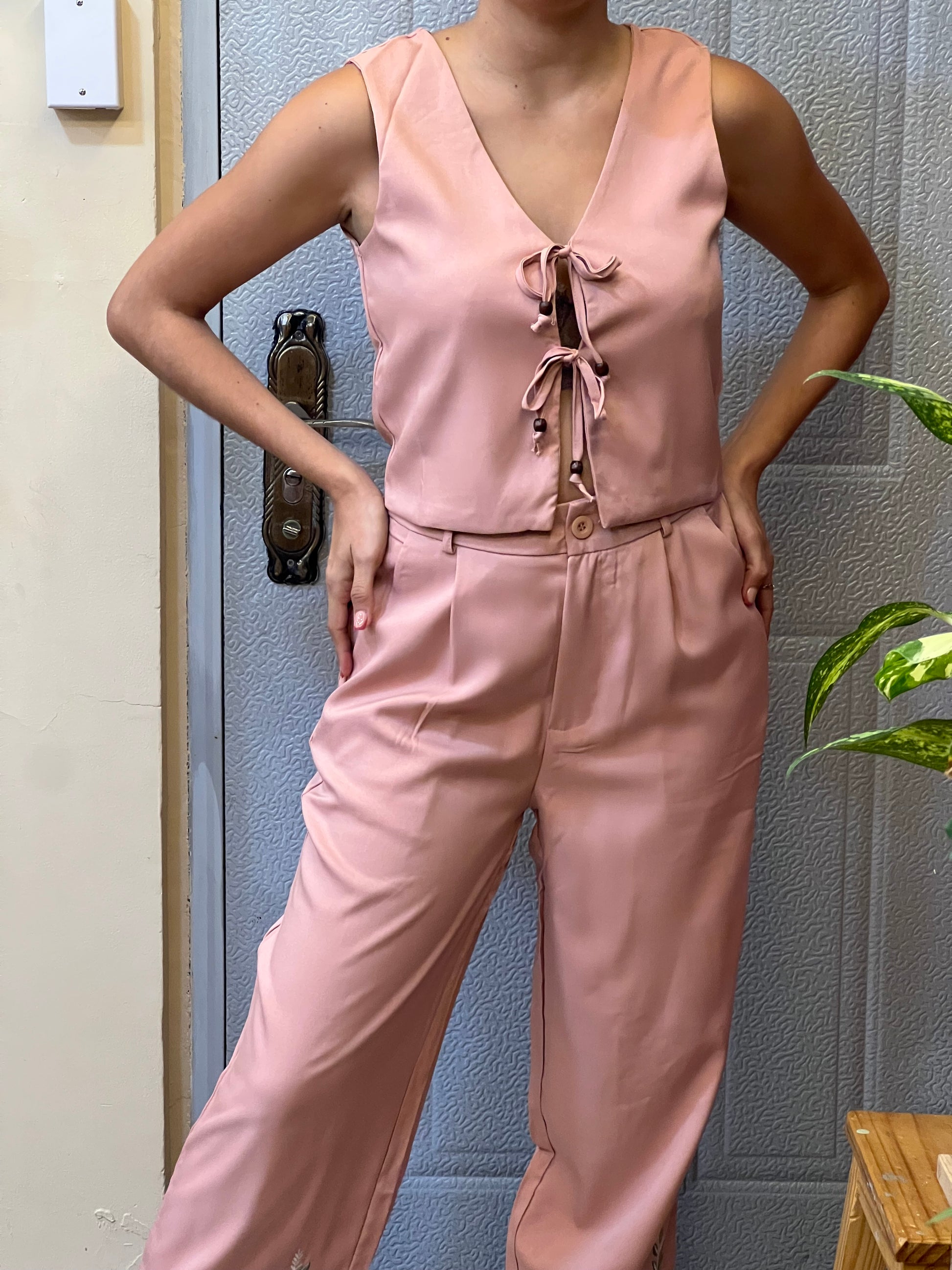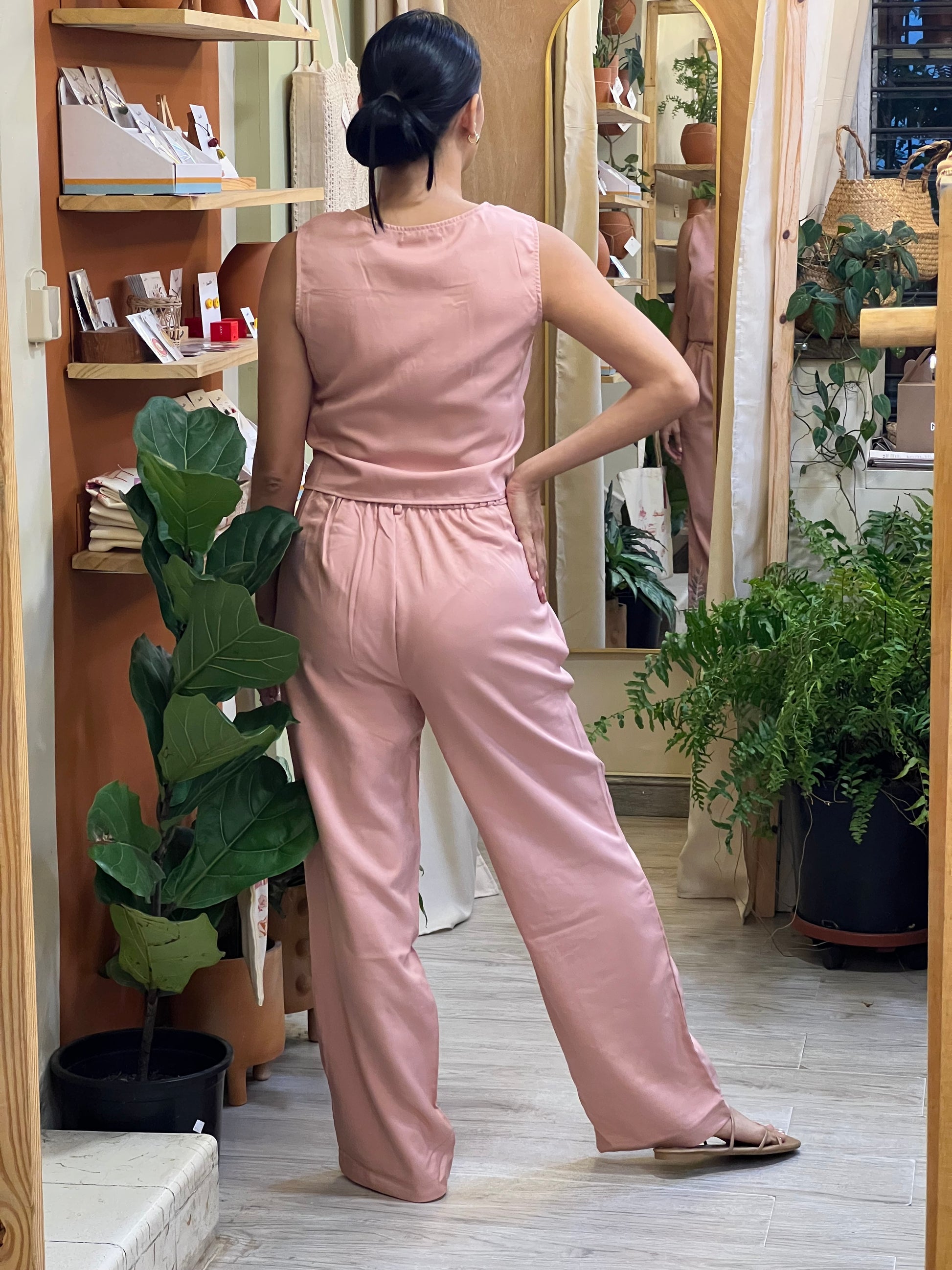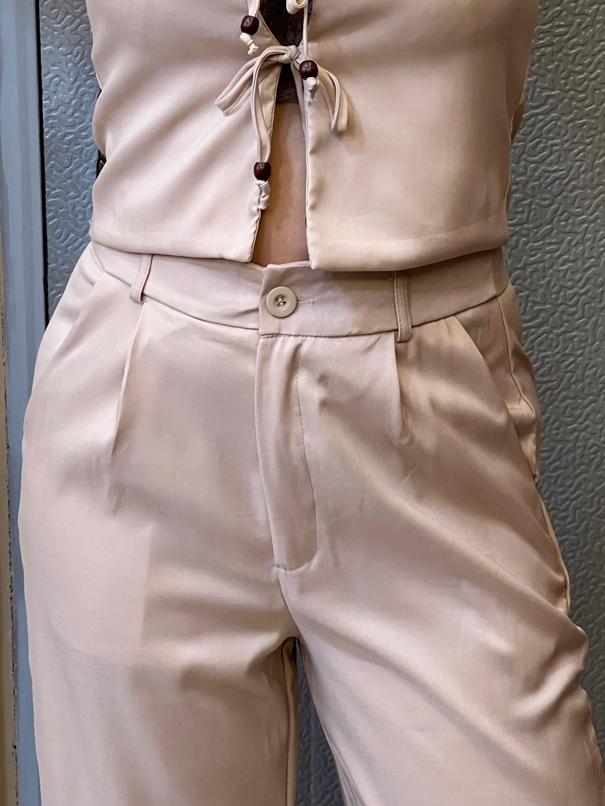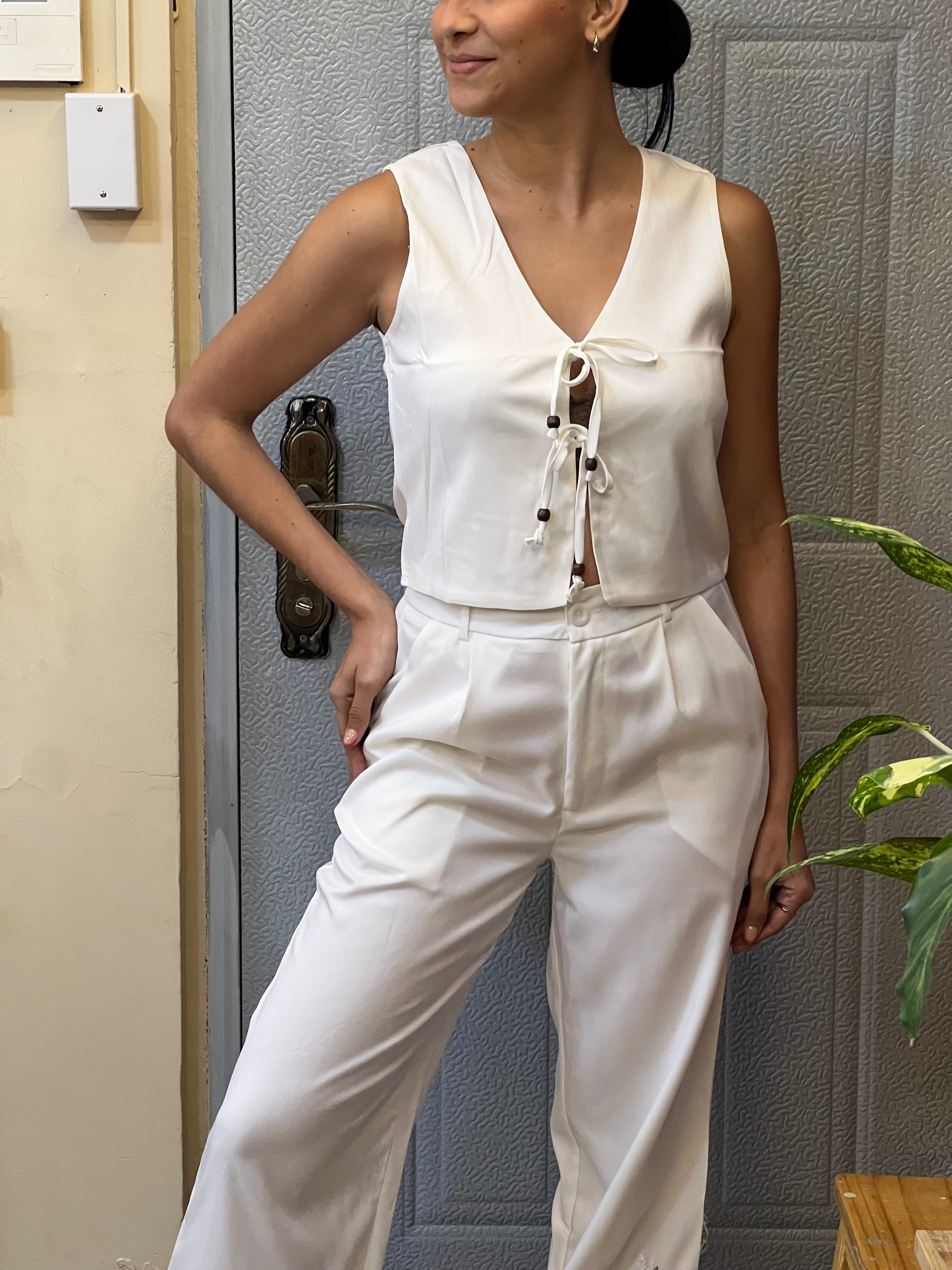 El top sin mangas con detalle de lazo frontal realza la silueta con un estilo moderno y femenino, combinando perfectamente con el pantalón de corte recto que estiliza y alarga la figura.