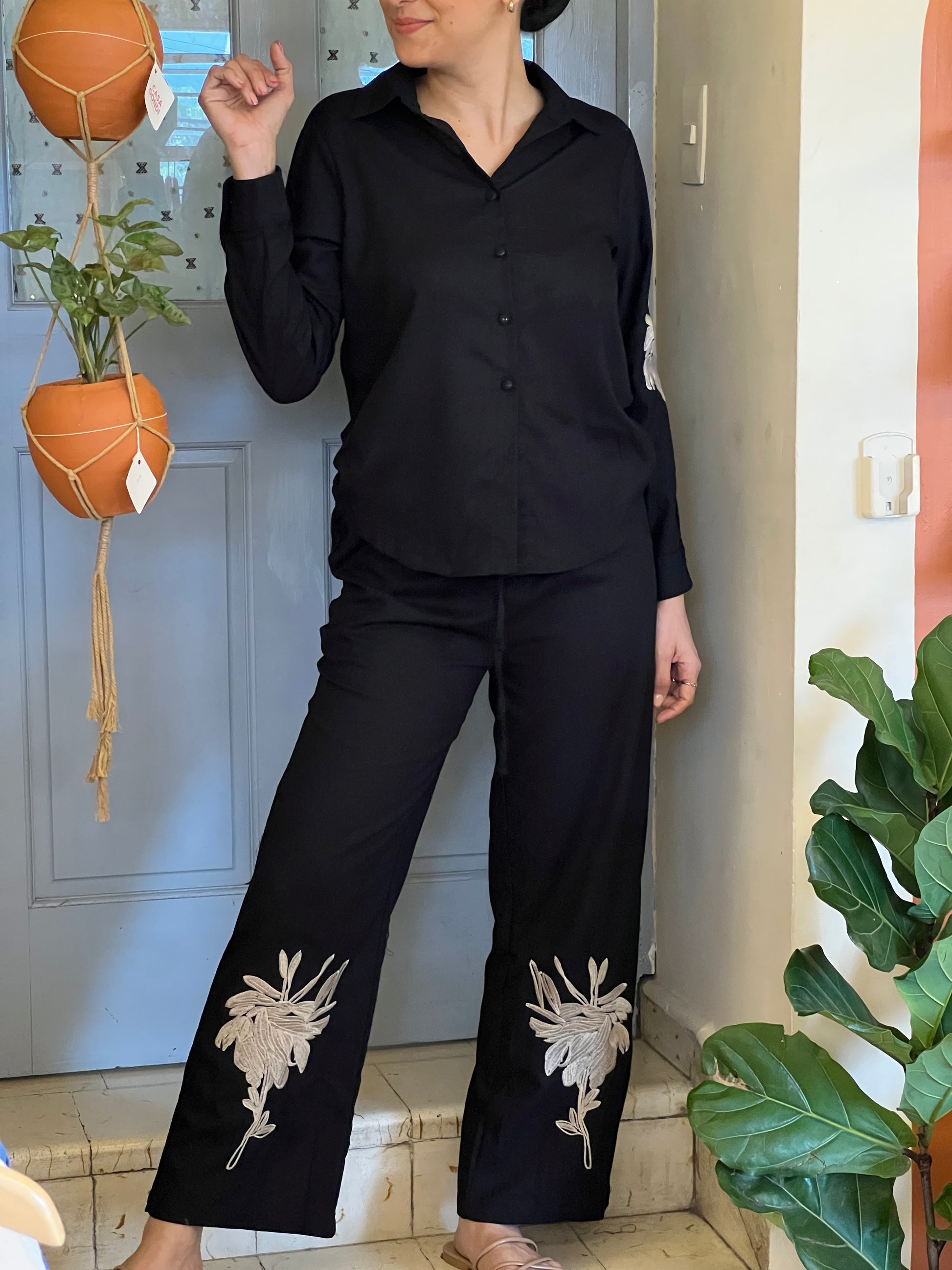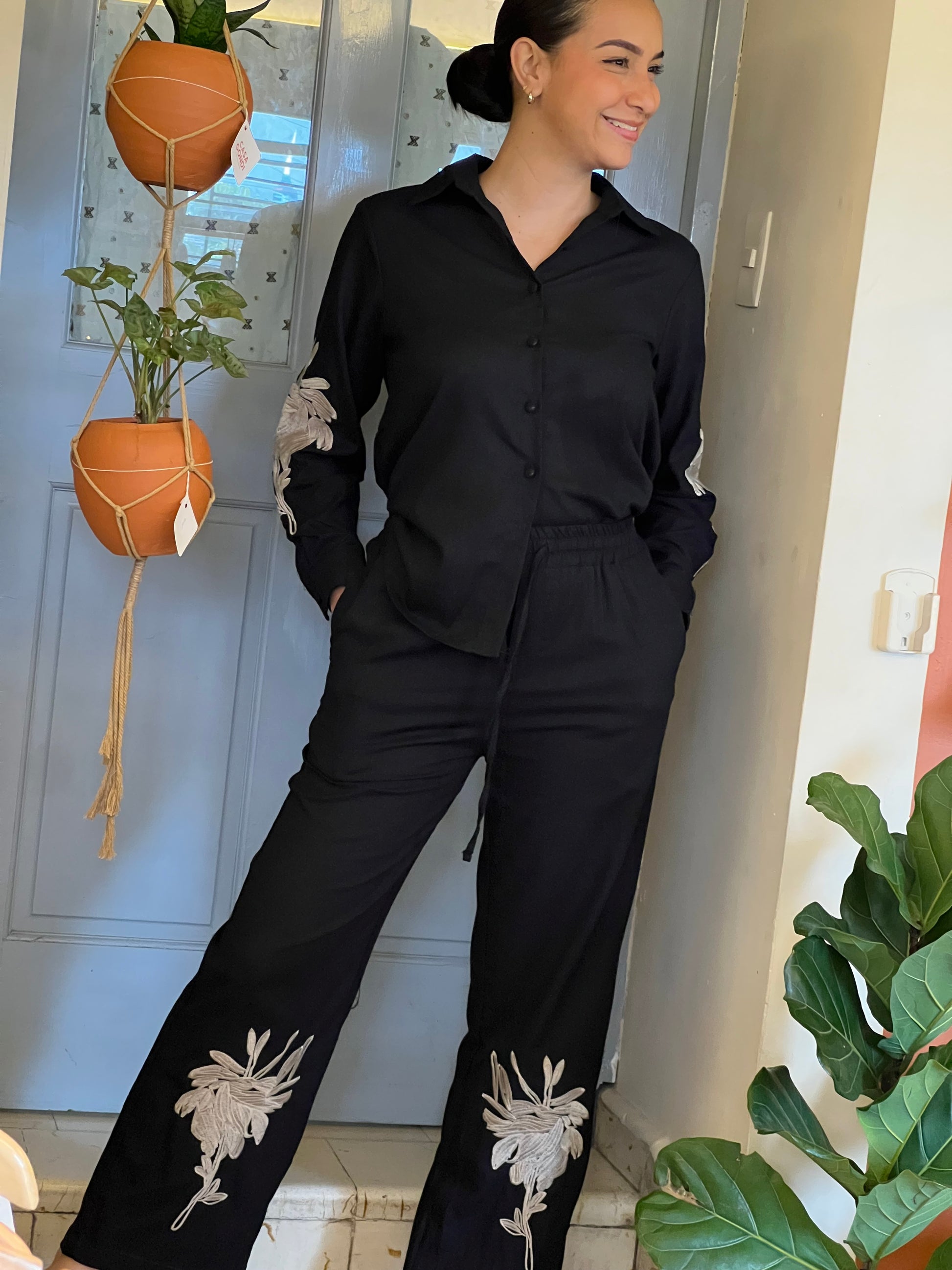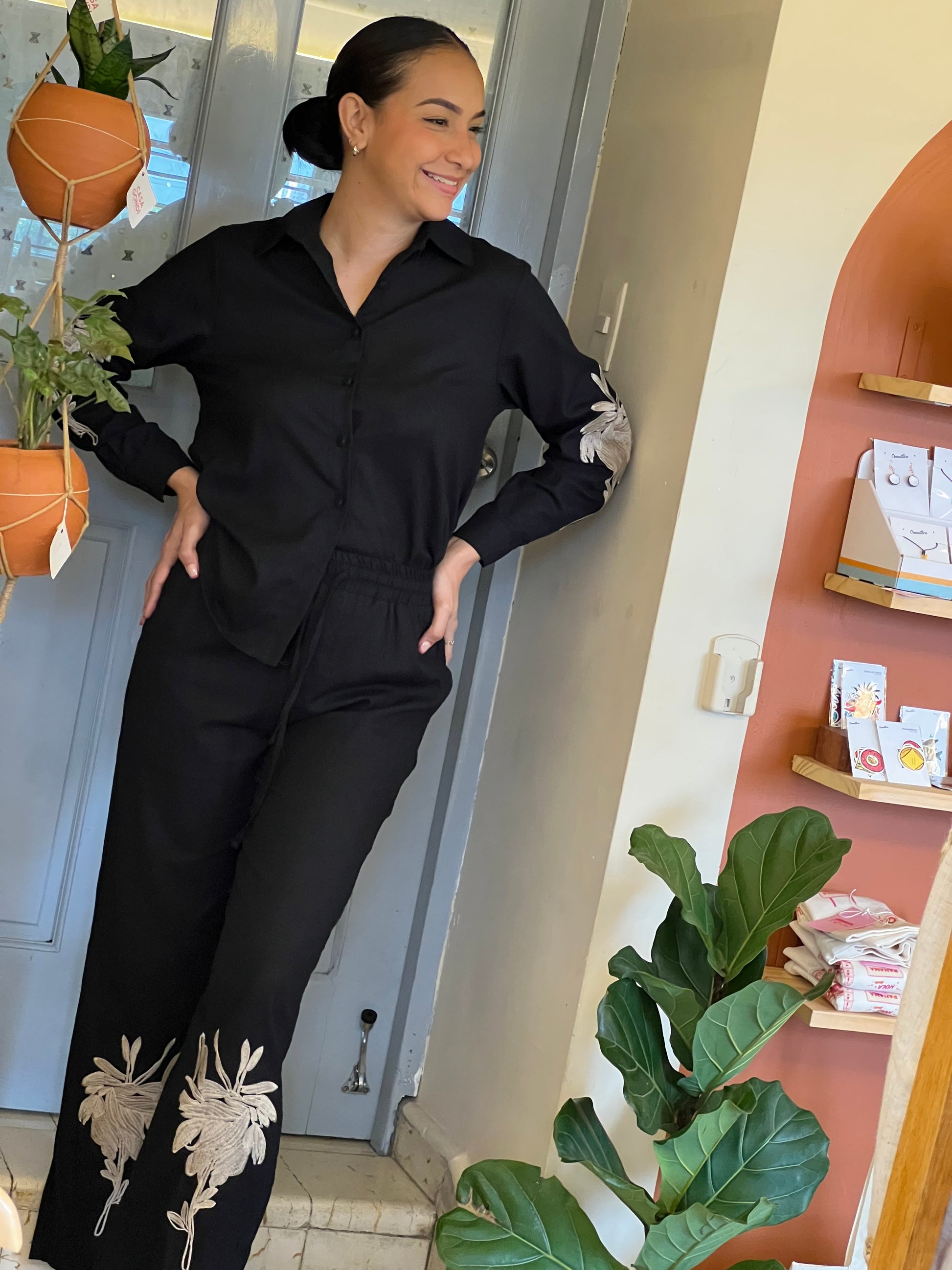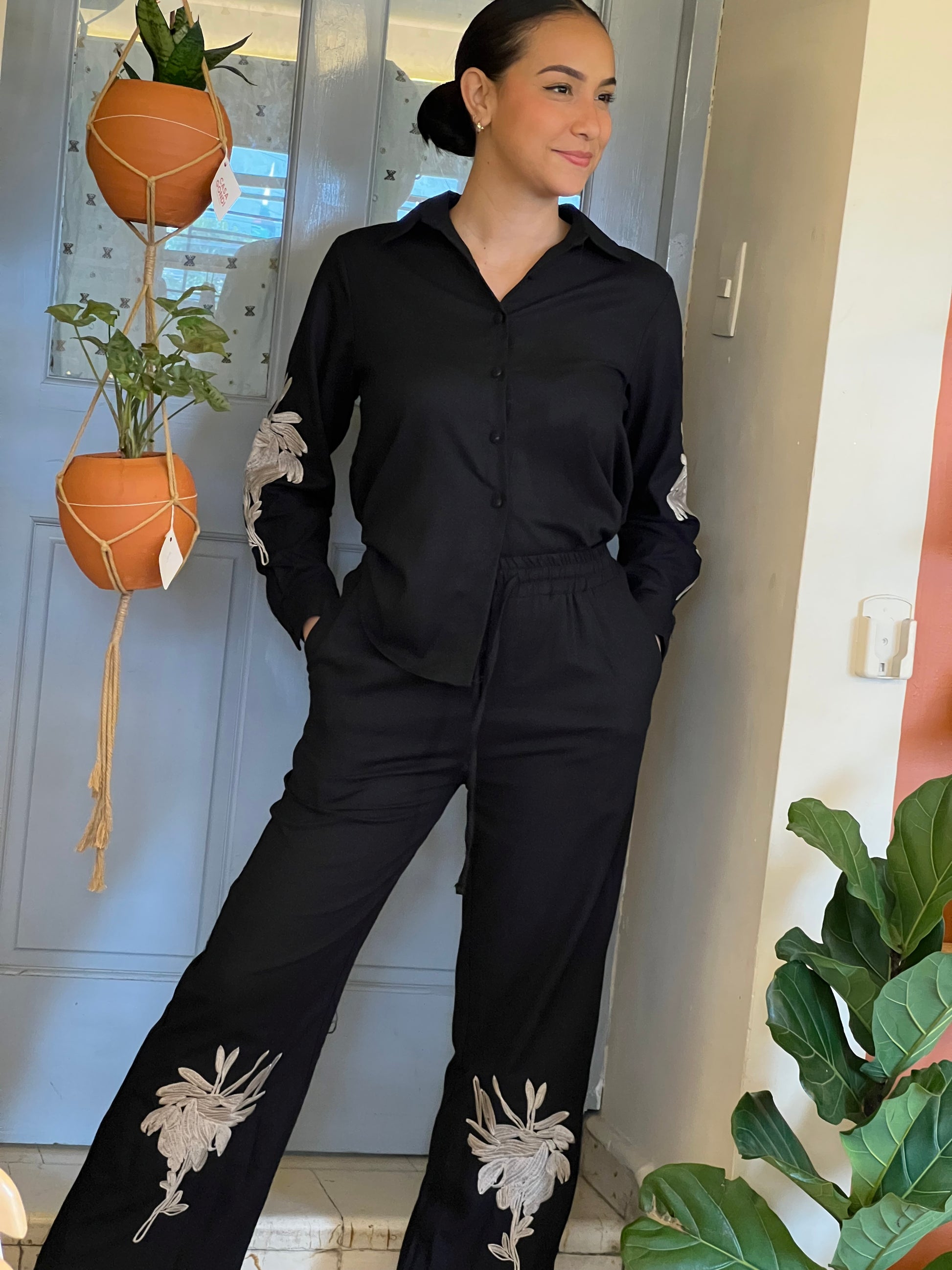 Este conjunto de dos piezas, elaborado en lino de alta calidad, es la elección perfecta para quienes buscan un look fresco, elegante y versátil. Su diseño minimalista con detalles de bordado delicado en mangas y pantalón aporta un toque artesanal único que eleva la prenda sin perder comodidad.