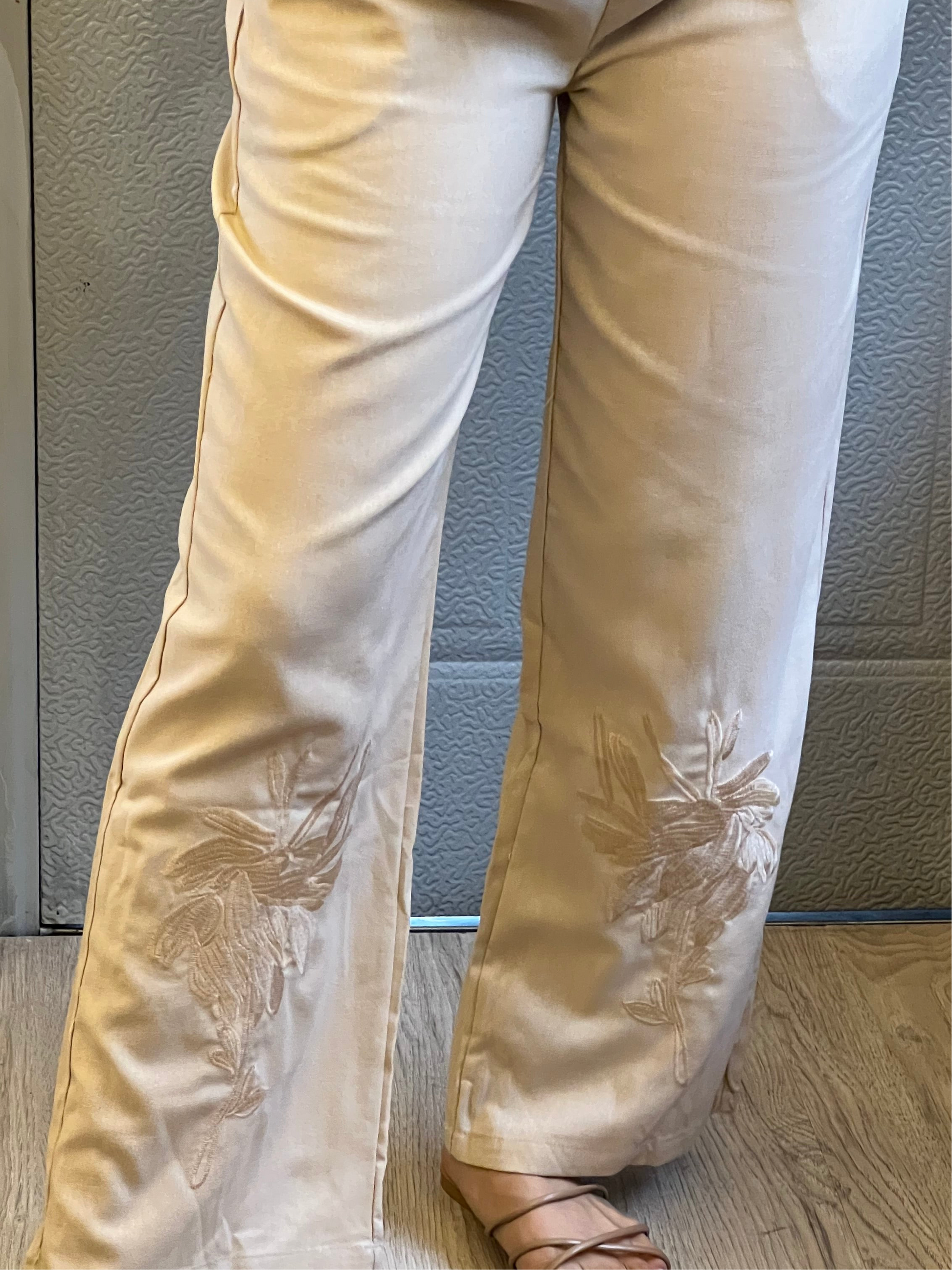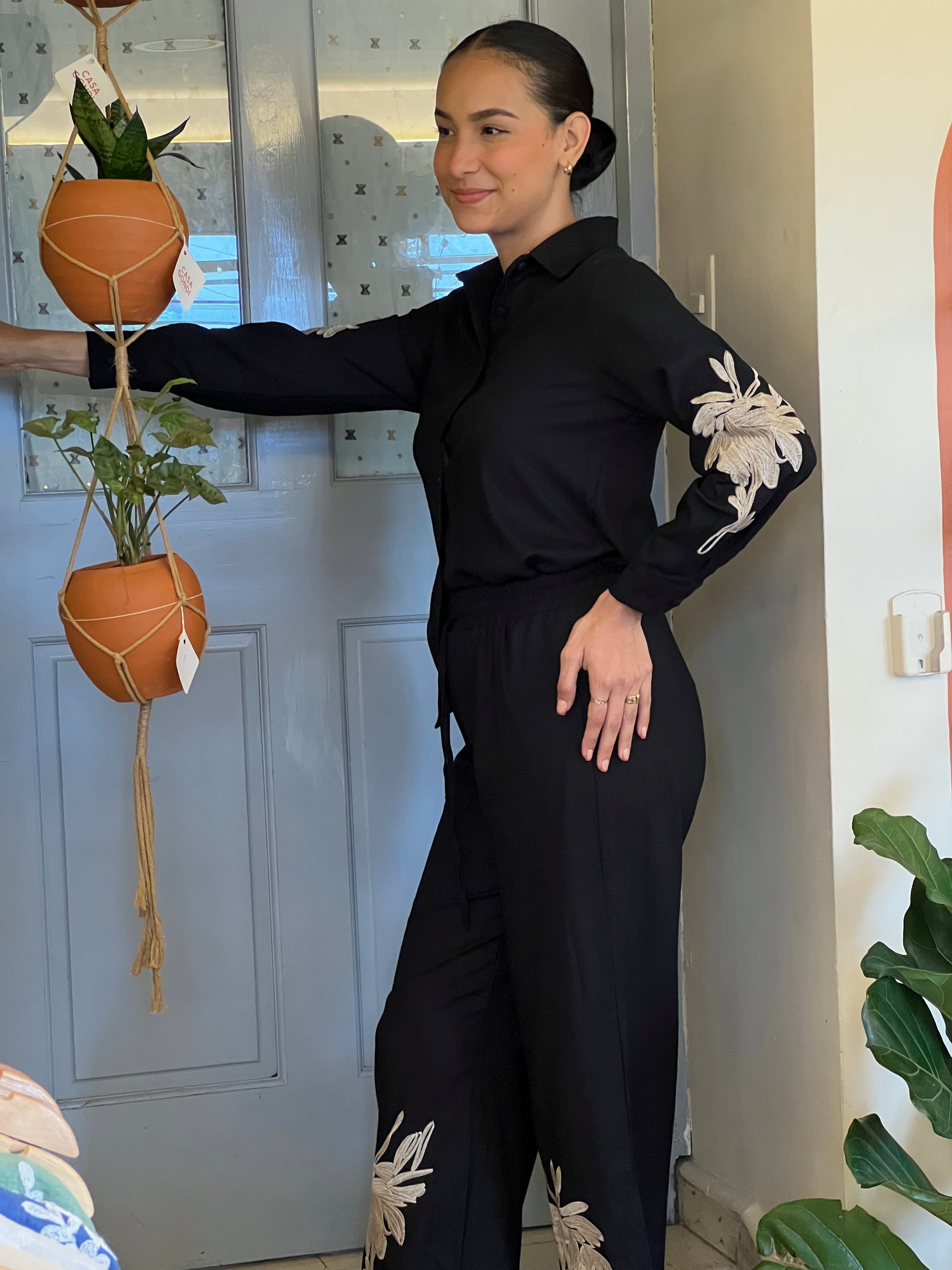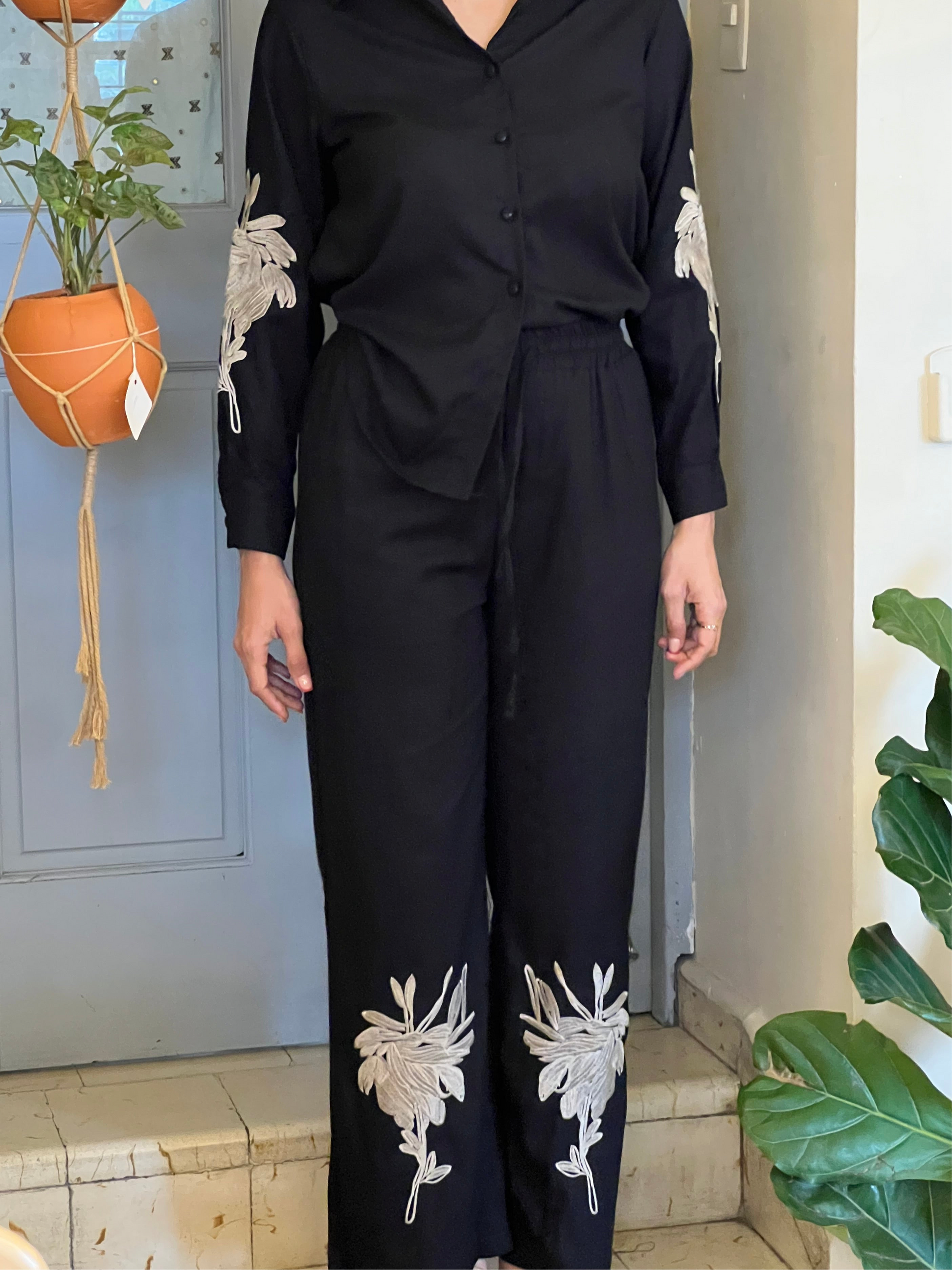 Este conjunto de dos piezas, elaborado en lino de alta calidad, es la elección perfecta para quienes buscan un look fresco, elegante y versátil. Su diseño minimalista con detalles de bordado delicado en mangas y pantalón aporta un toque artesanal único que eleva la prenda sin perder comodidad.
