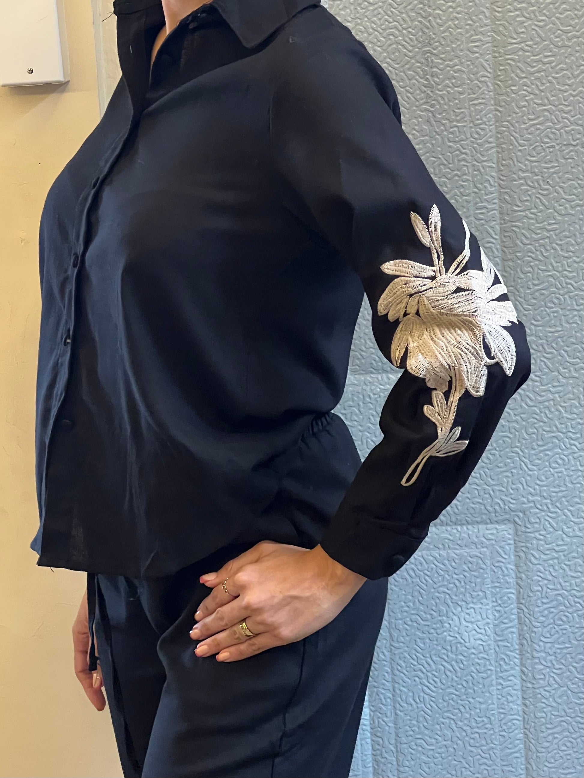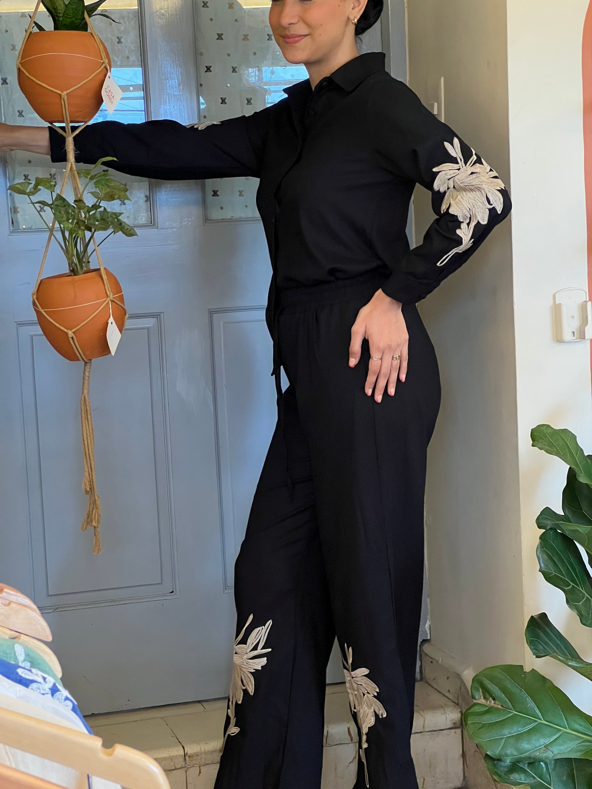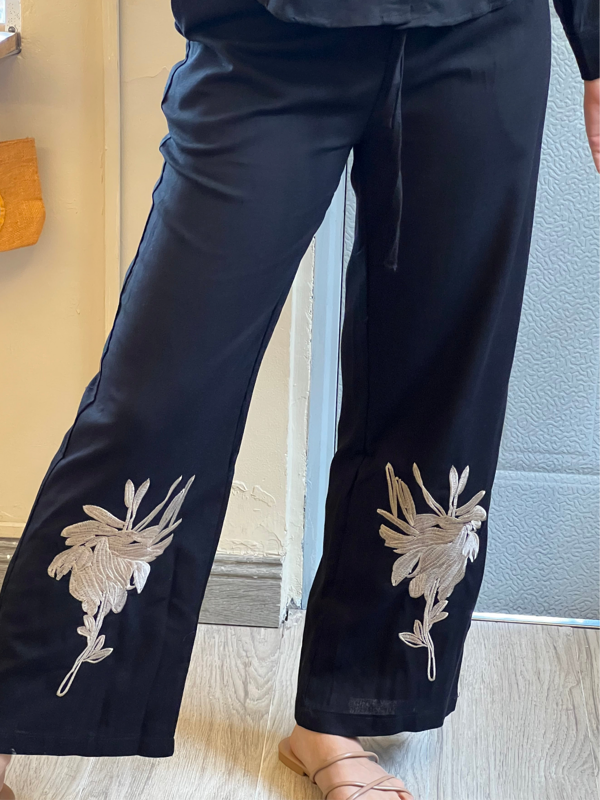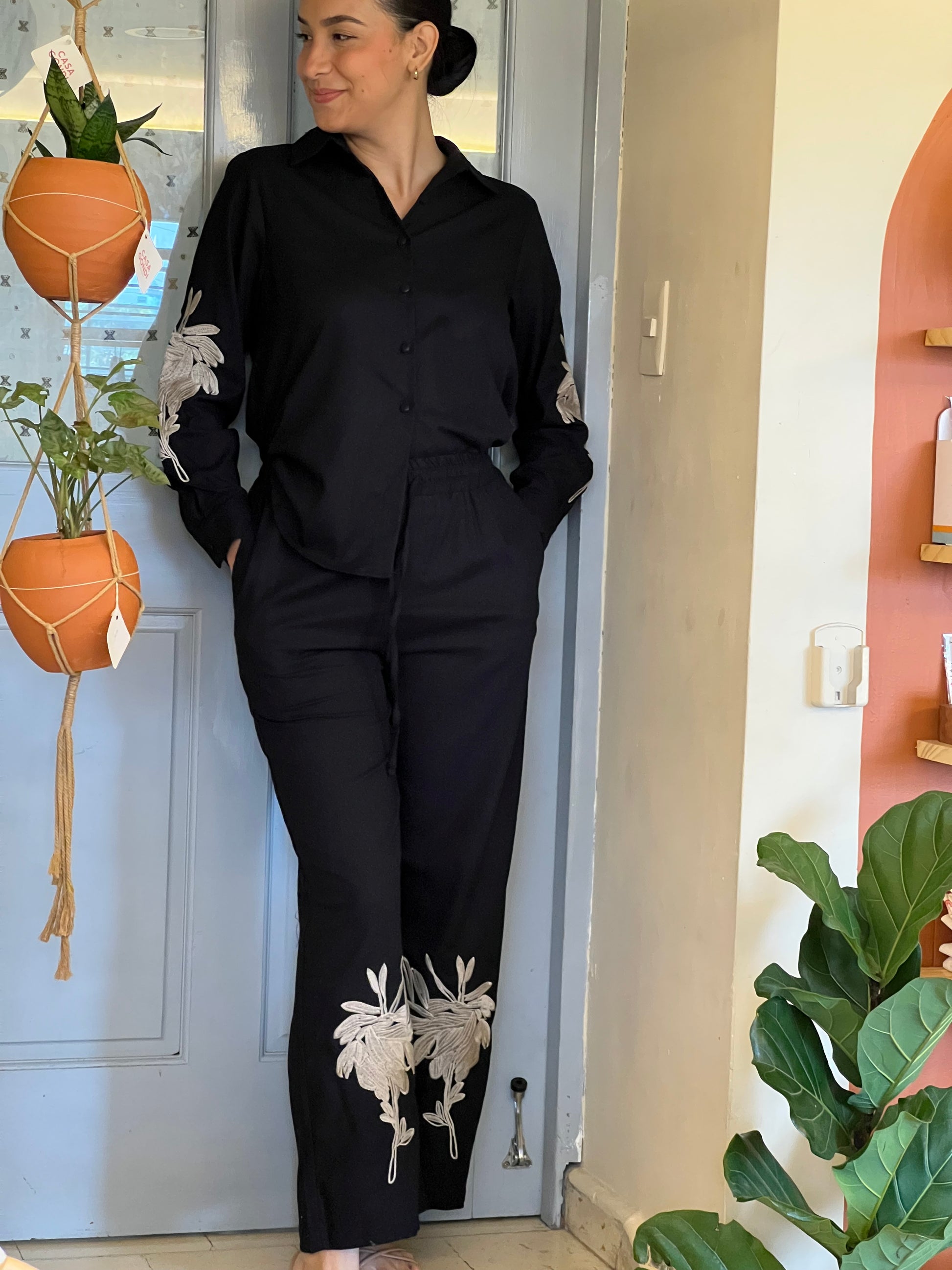 Este conjunto de dos piezas, elaborado en lino de alta calidad, es la elección perfecta para quienes buscan un look fresco, elegante y versátil. Su diseño minimalista con detalles de bordado delicado en mangas y pantalón aporta un toque artesanal único que eleva la prenda sin perder comodidad.