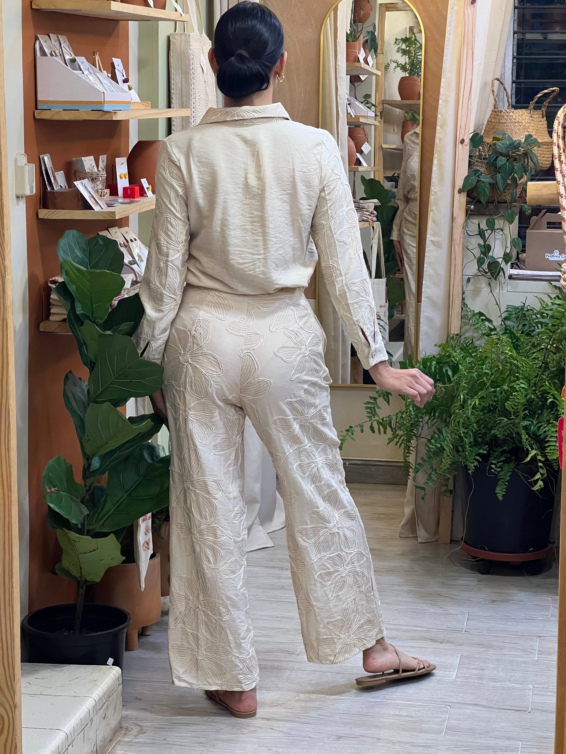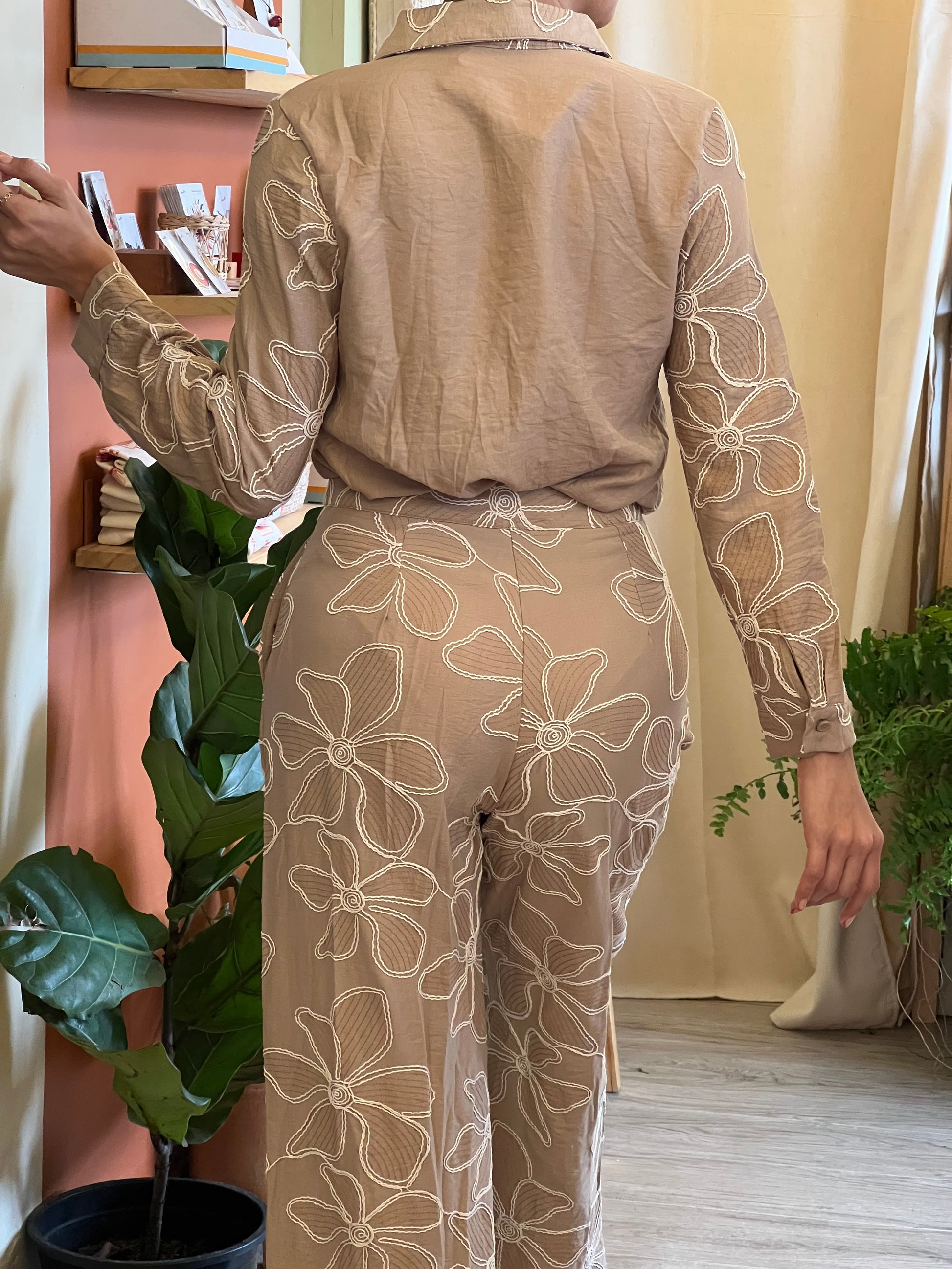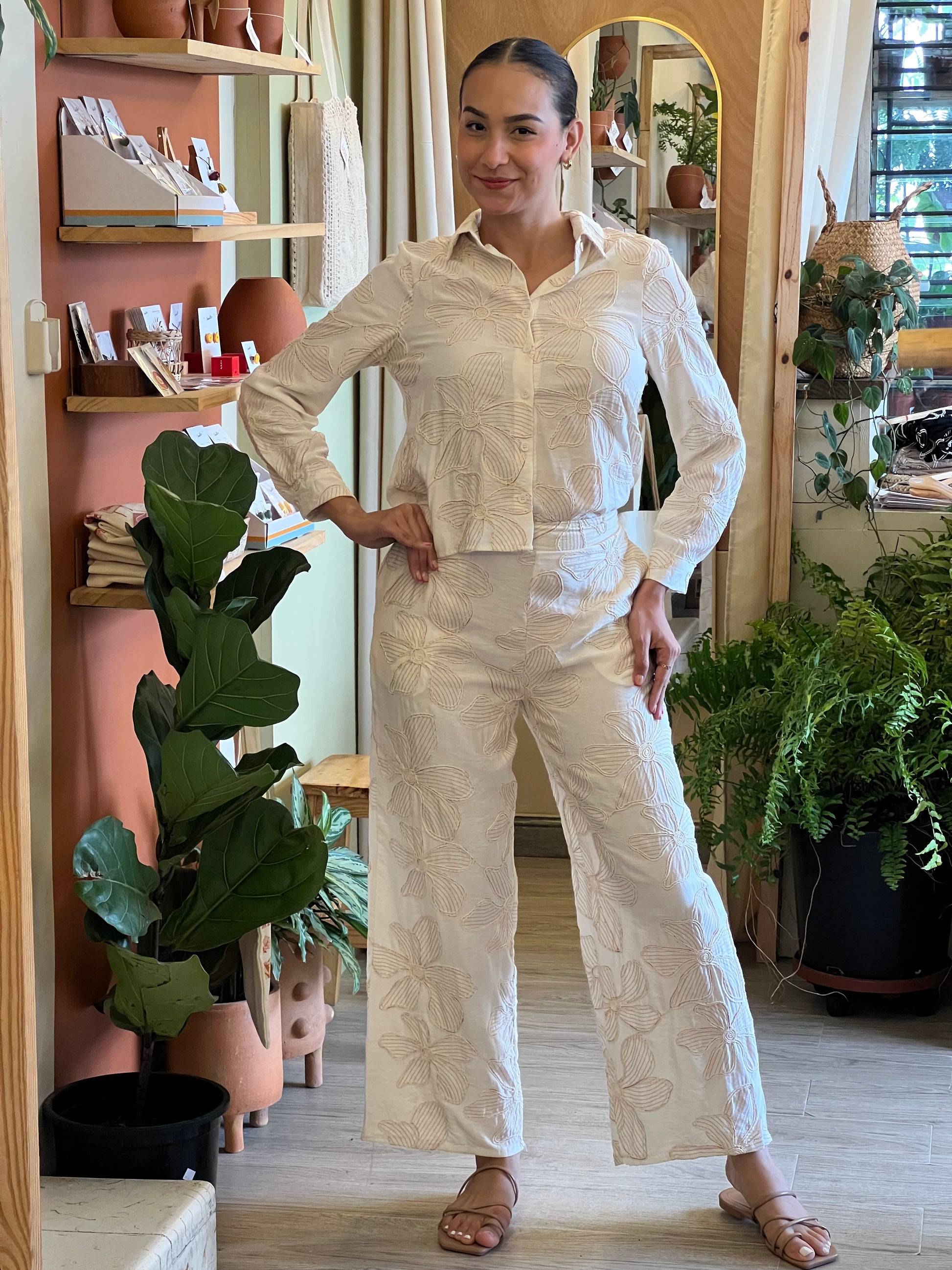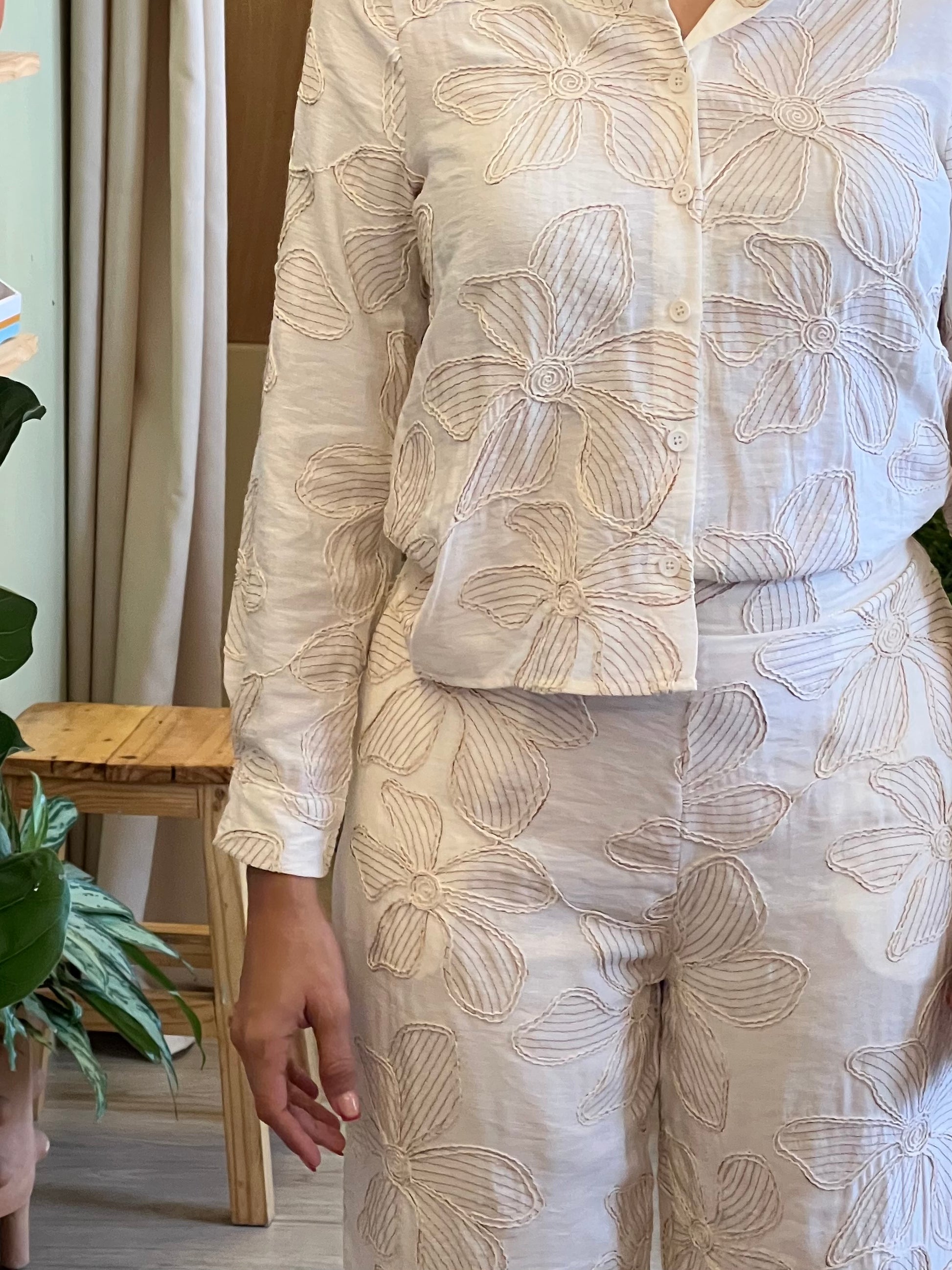 Este conjunto de pantalón y blusa de manga larga es la combinación perfecta de elegancia y frescura. Confeccionado en tela ligera y decorado con un bordado floral en relieve, aporta un estilo sofisticado sin perder la comodidad que necesitas para tu día a día.