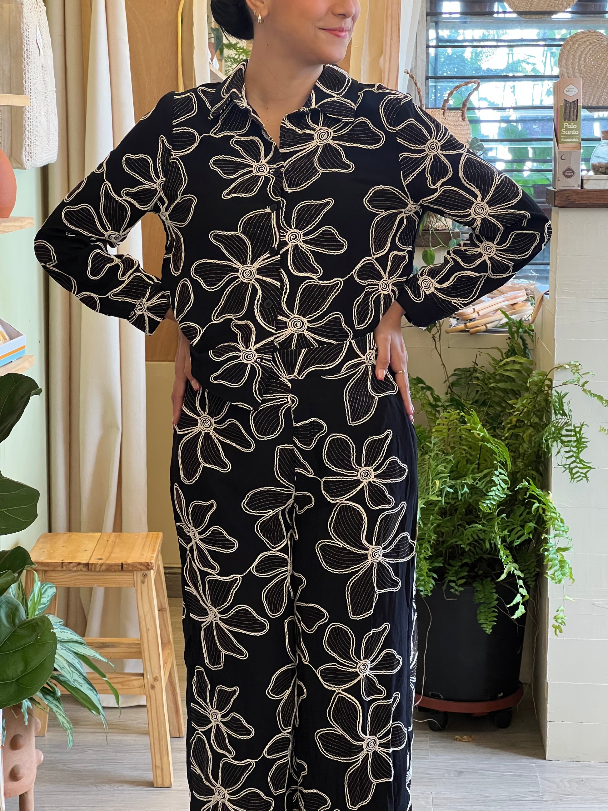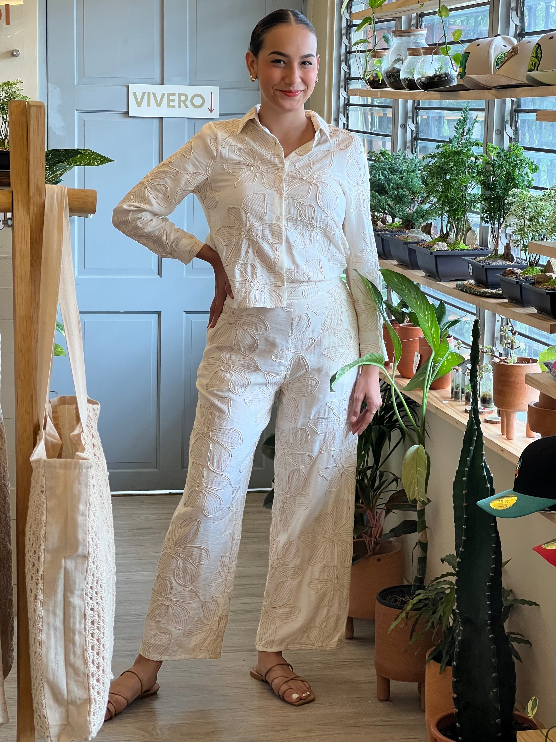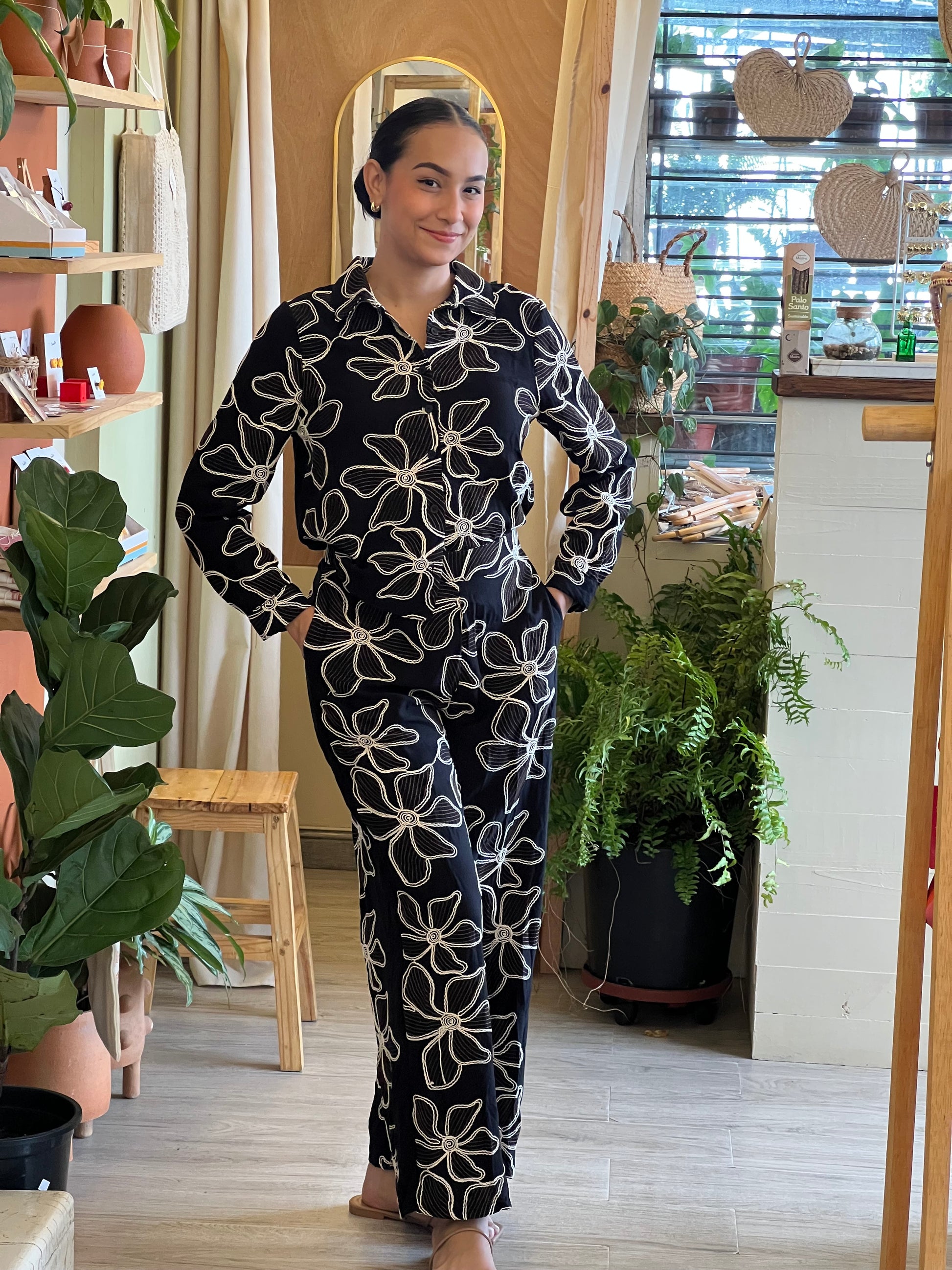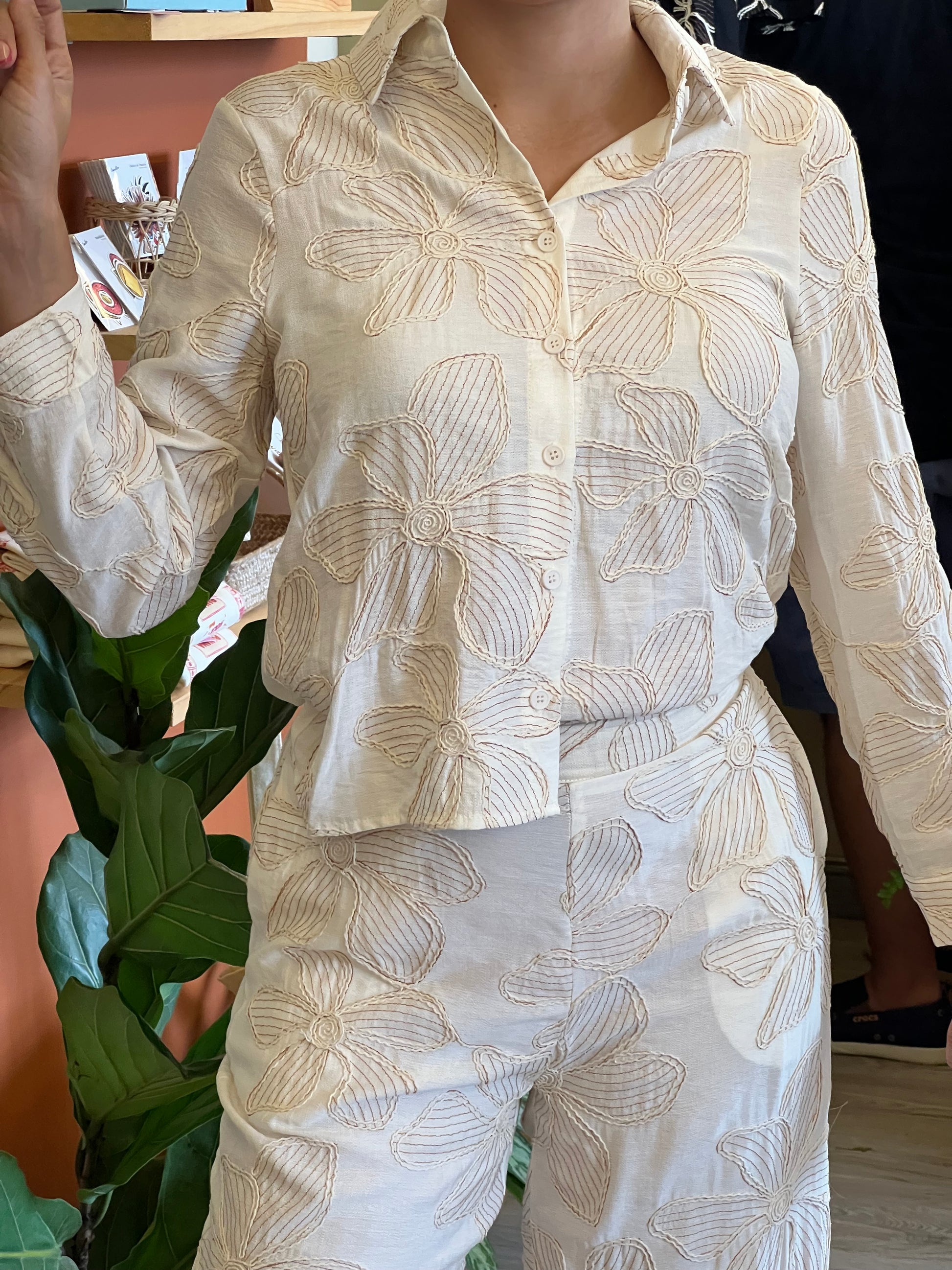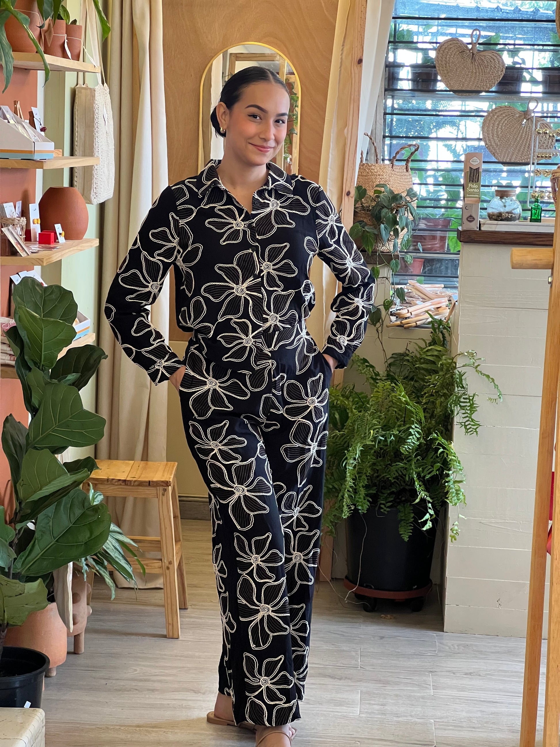 Este conjunto de pantalón y blusa de manga larga es la combinación perfecta de elegancia y frescura. Confeccionado en tela ligera y decorado con un bordado floral en relieve, aporta un estilo sofisticado sin perder la comodidad que necesitas para tu día a día.