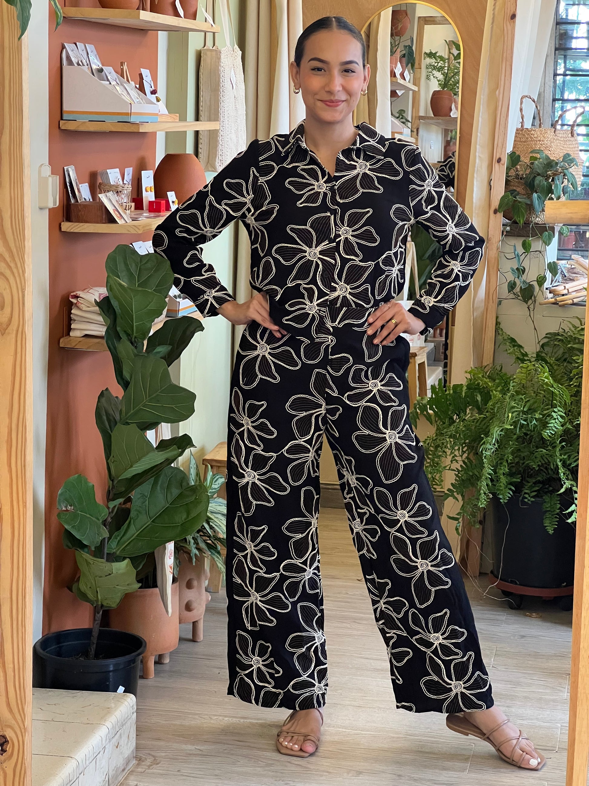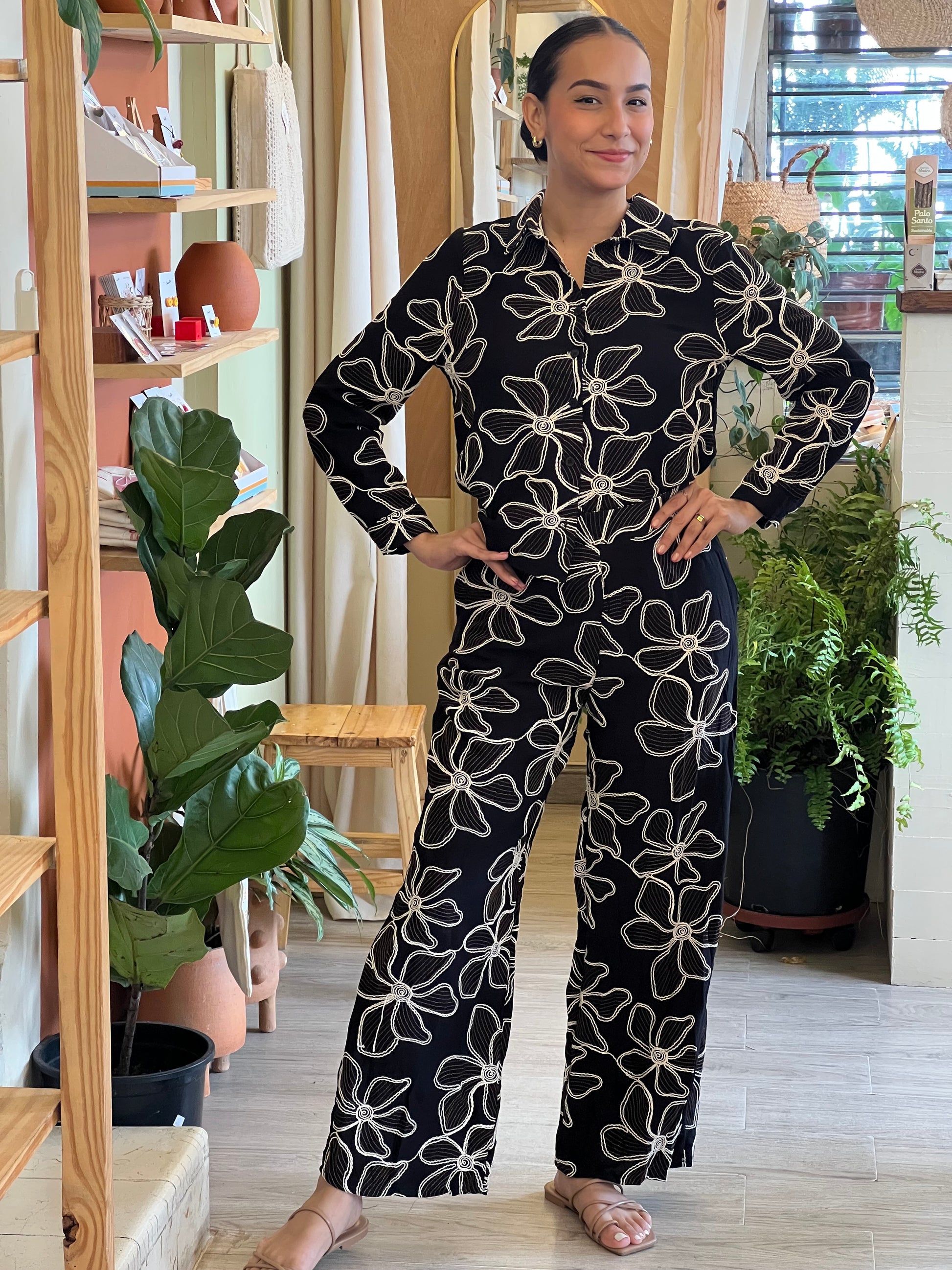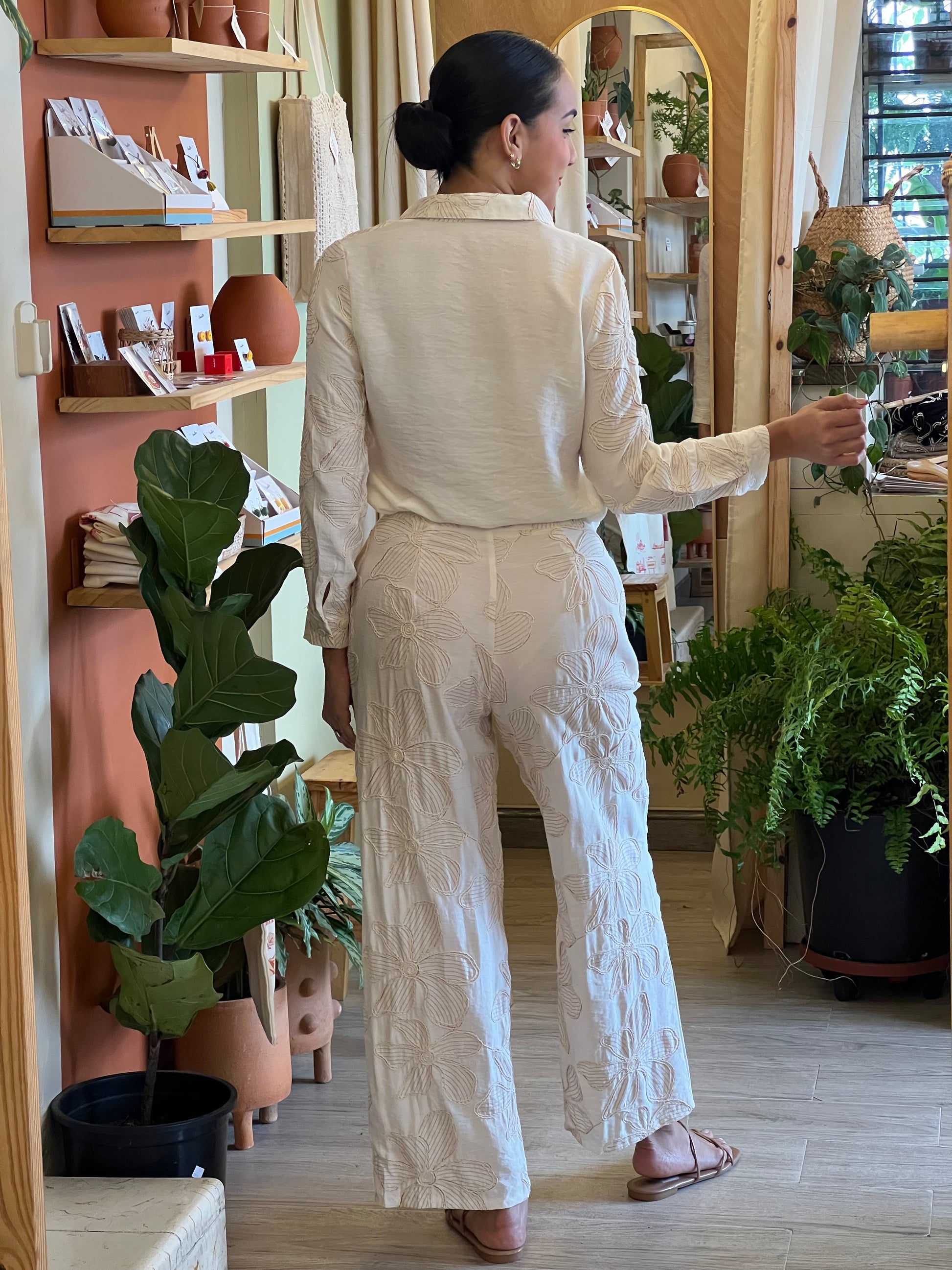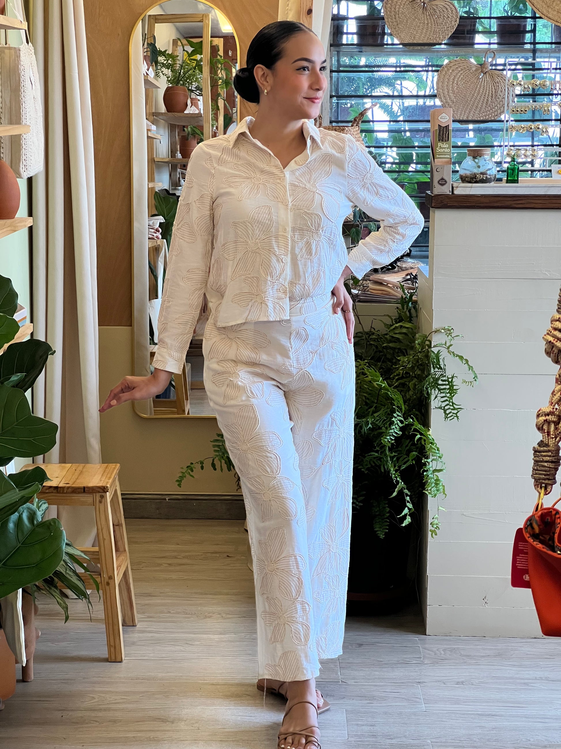 Este conjunto de pantalón y blusa de manga larga es la combinación perfecta de elegancia y frescura. Confeccionado en tela ligera y decorado con un bordado floral en relieve, aporta un estilo sofisticado sin perder la comodidad que necesitas para tu día a día.