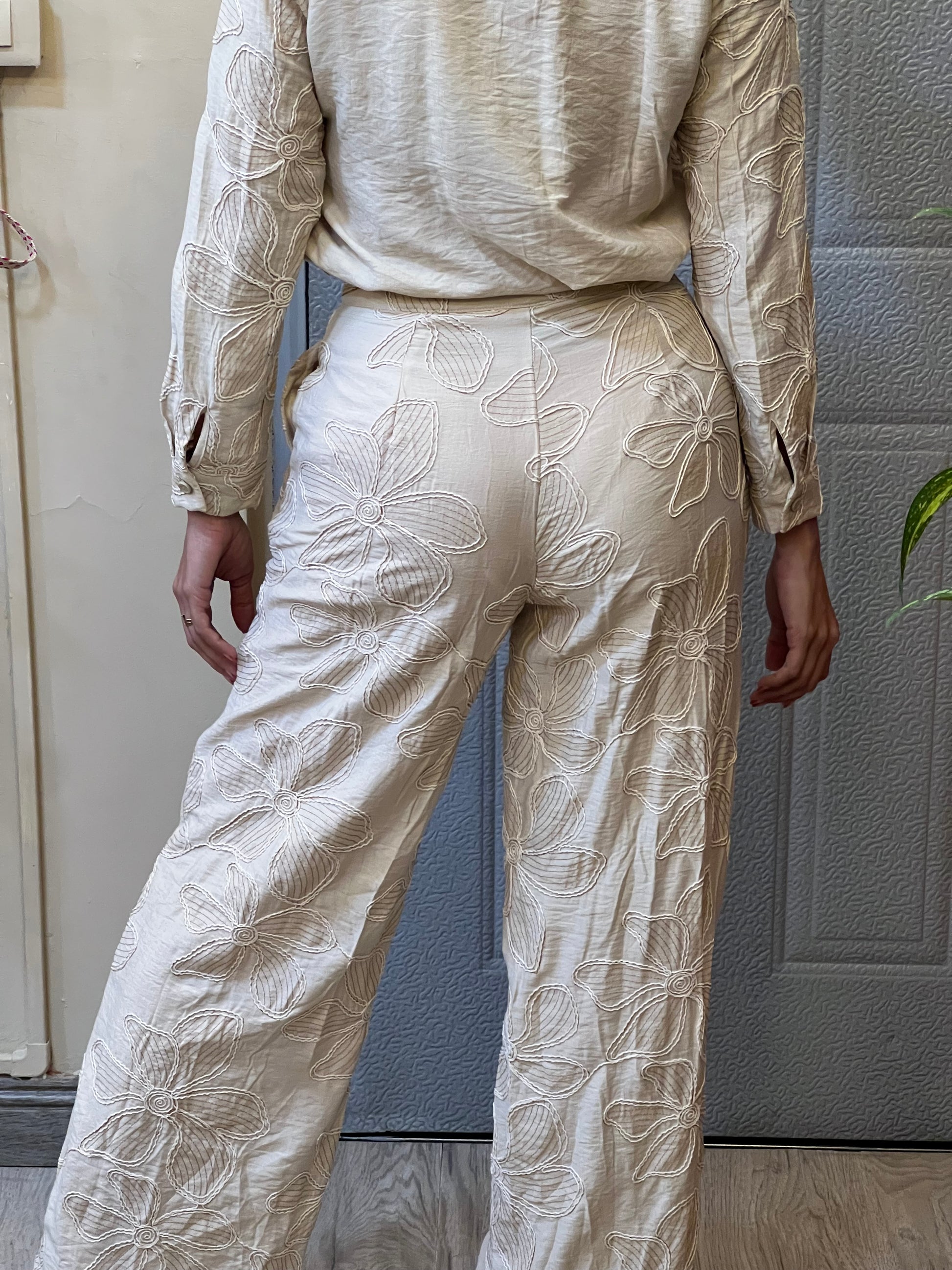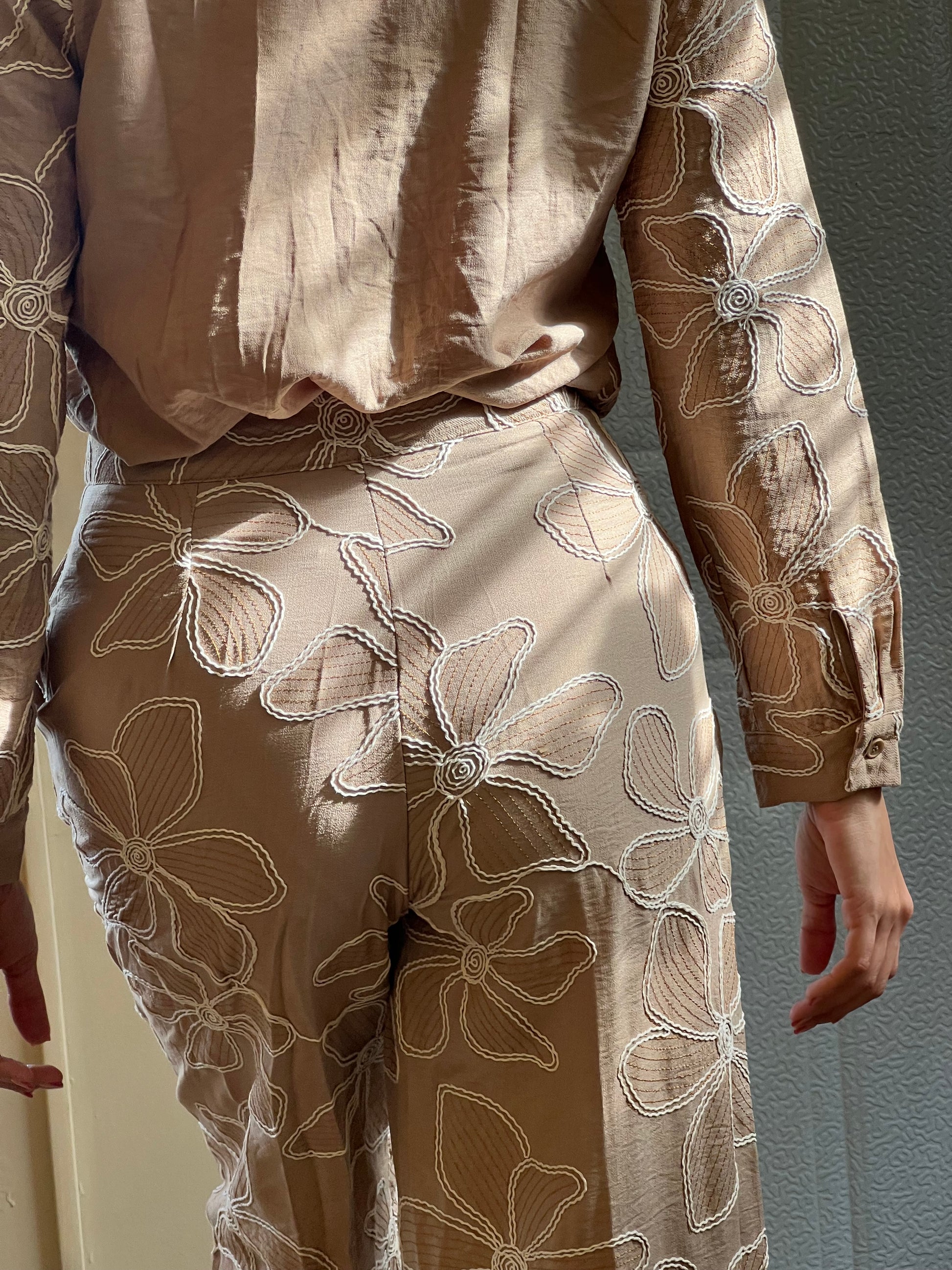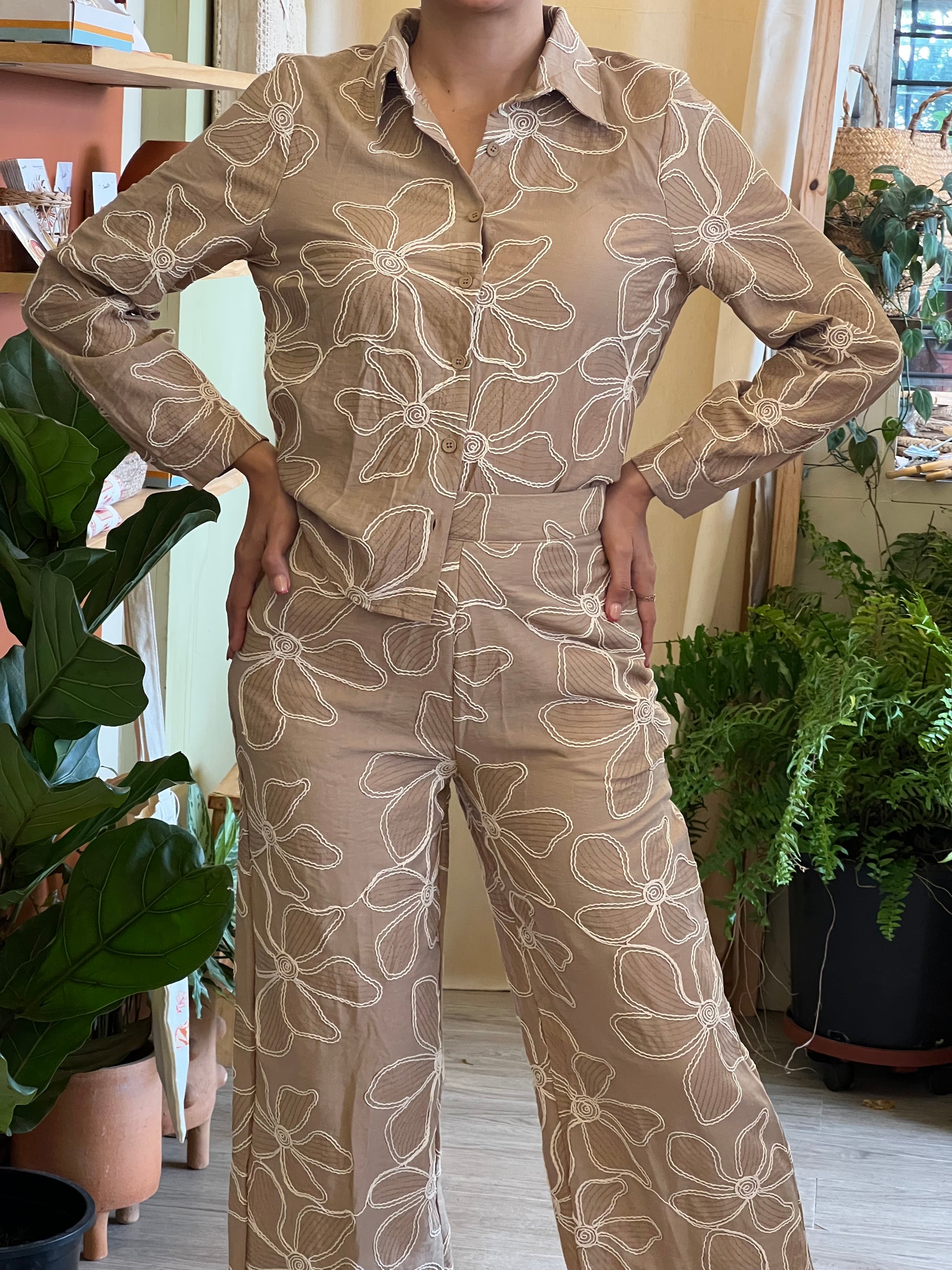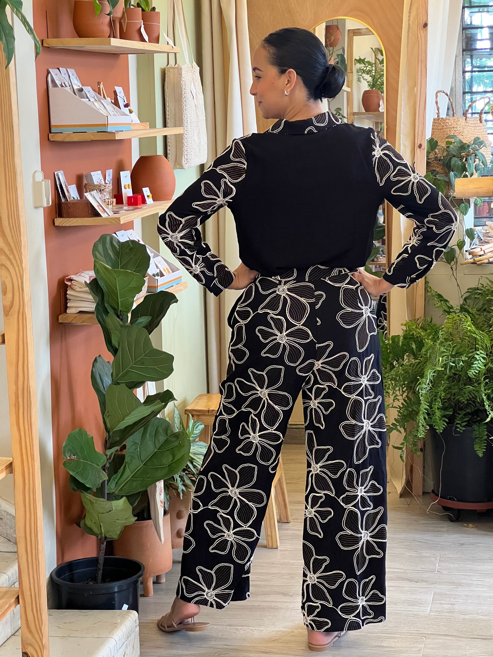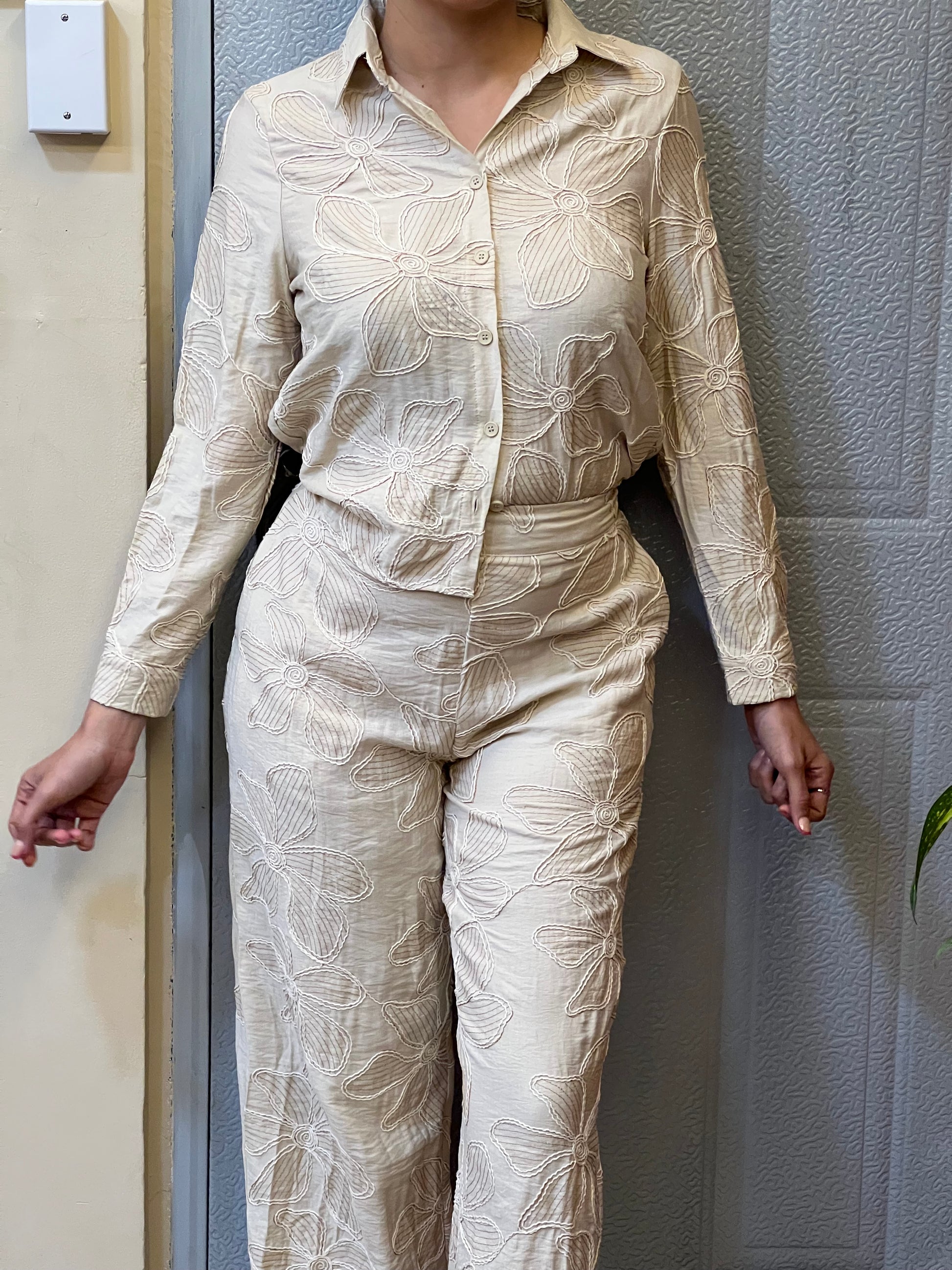 Este conjunto de pantalón y blusa de manga larga es la combinación perfecta de elegancia y frescura. Confeccionado en tela ligera y decorado con un bordado floral en relieve, aporta un estilo sofisticado sin perder la comodidad que necesitas para tu día a día.