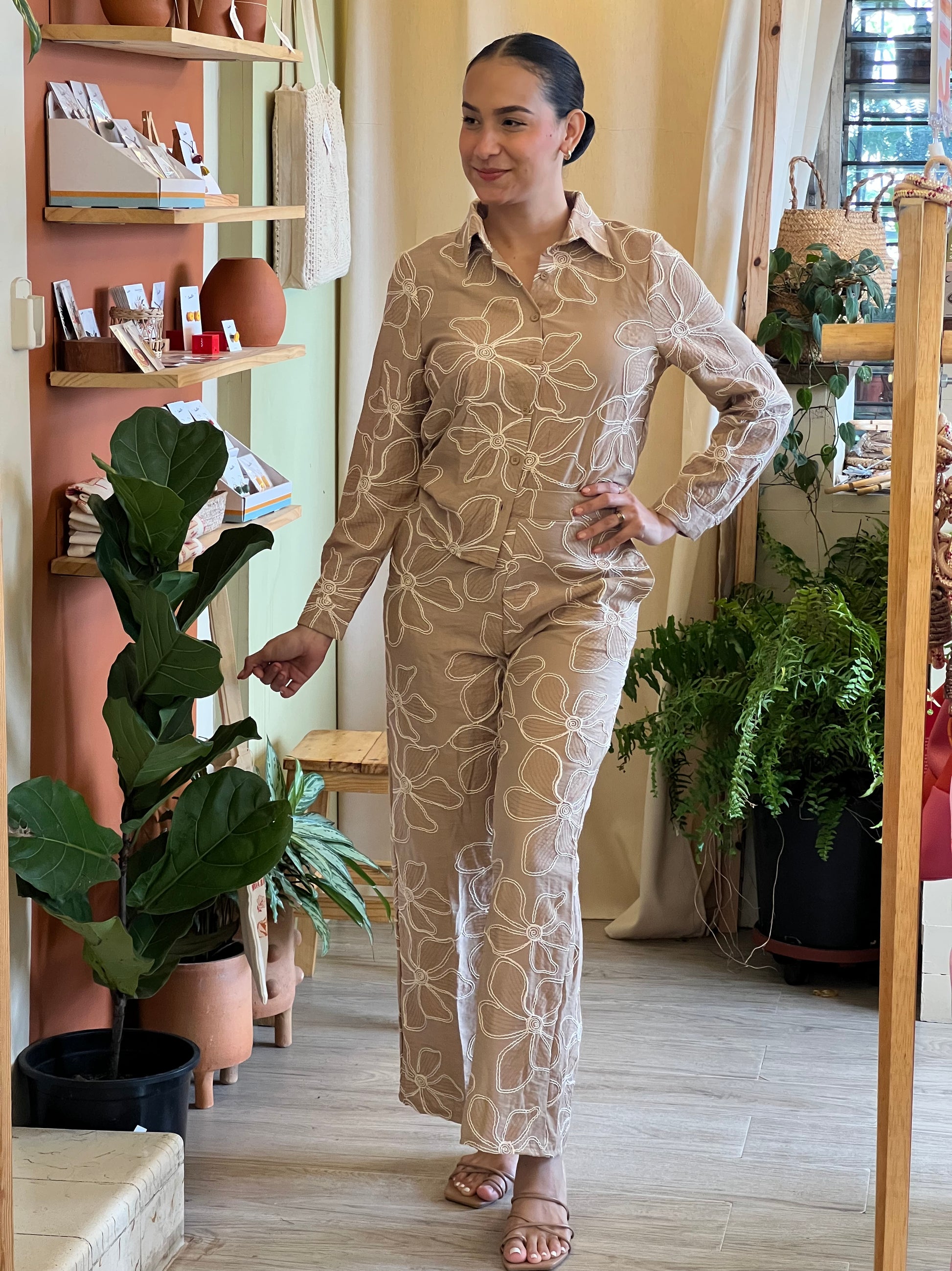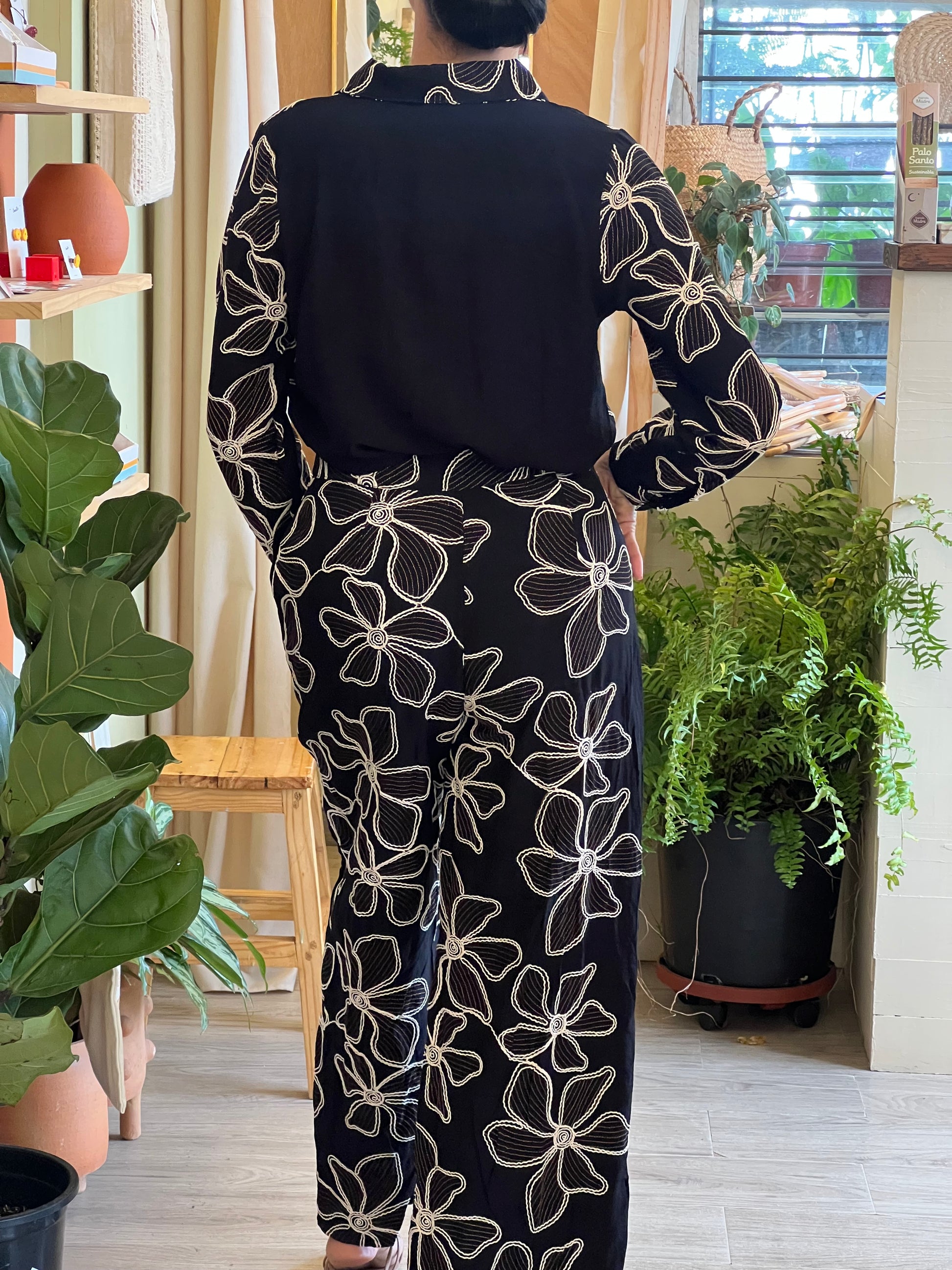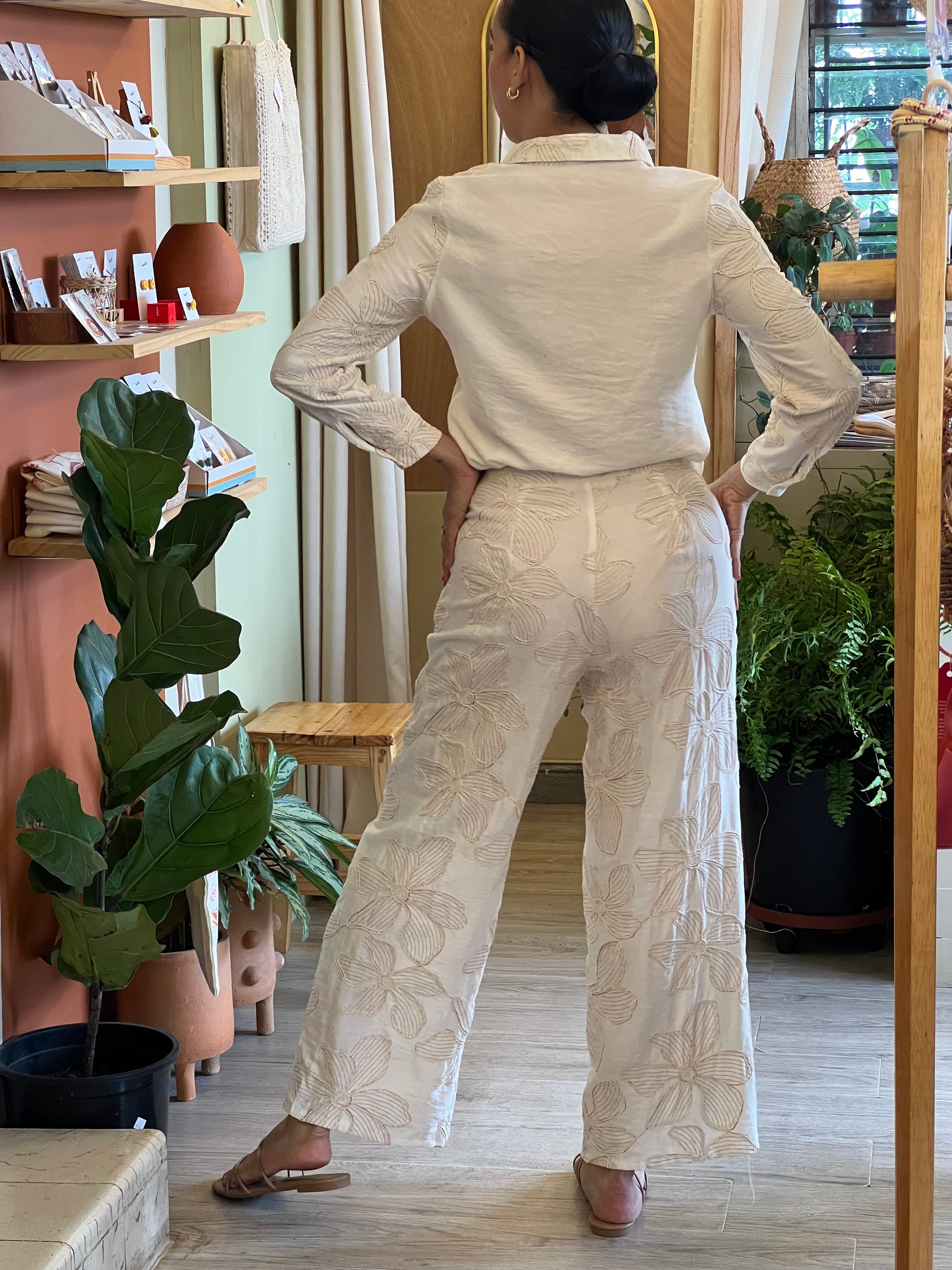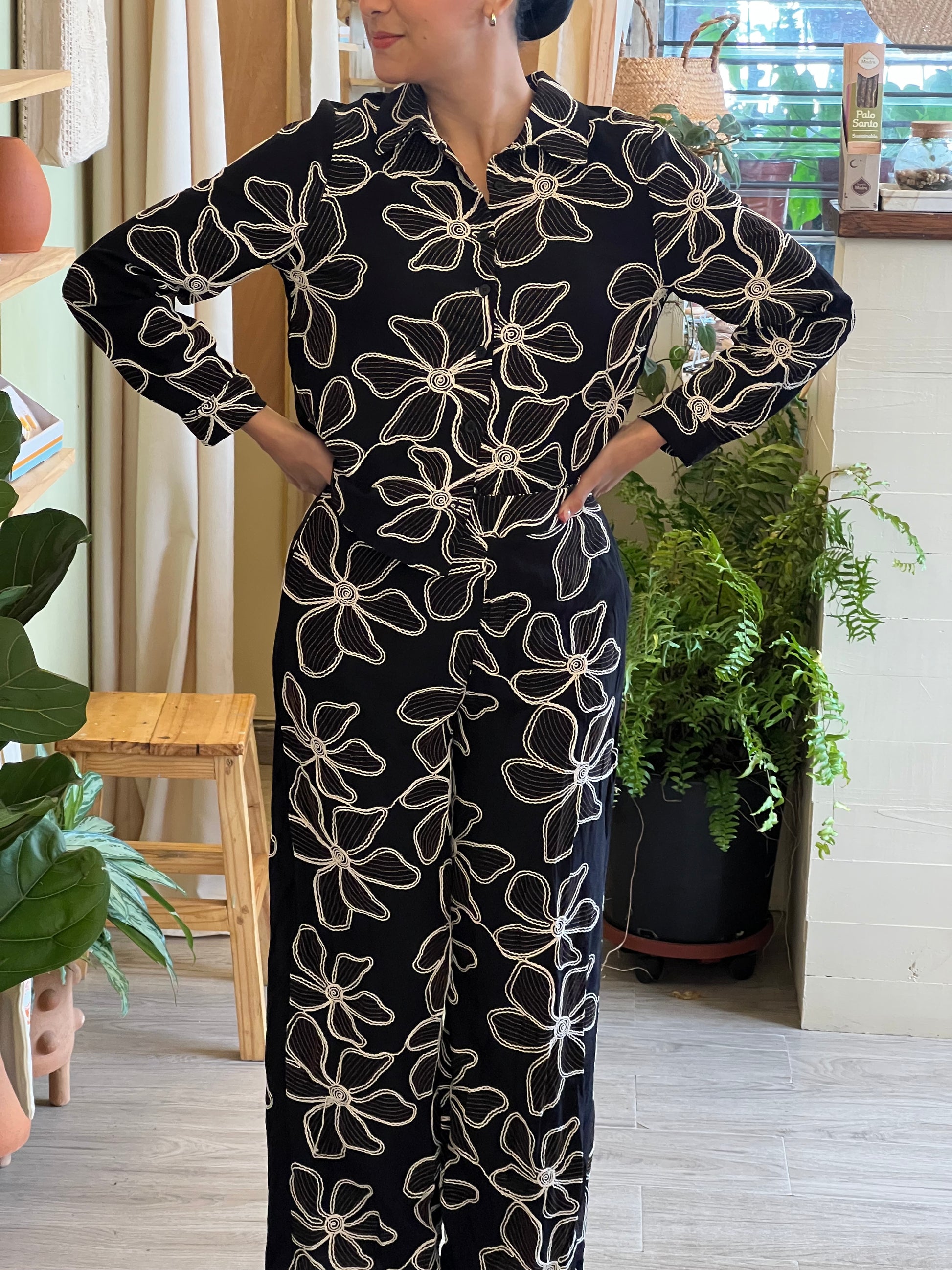 Este conjunto de pantalón y blusa de manga larga es la combinación perfecta de elegancia y frescura. Confeccionado en tela ligera y decorado con un bordado floral en relieve, aporta un estilo sofisticado sin perder la comodidad que necesitas para tu día a día.