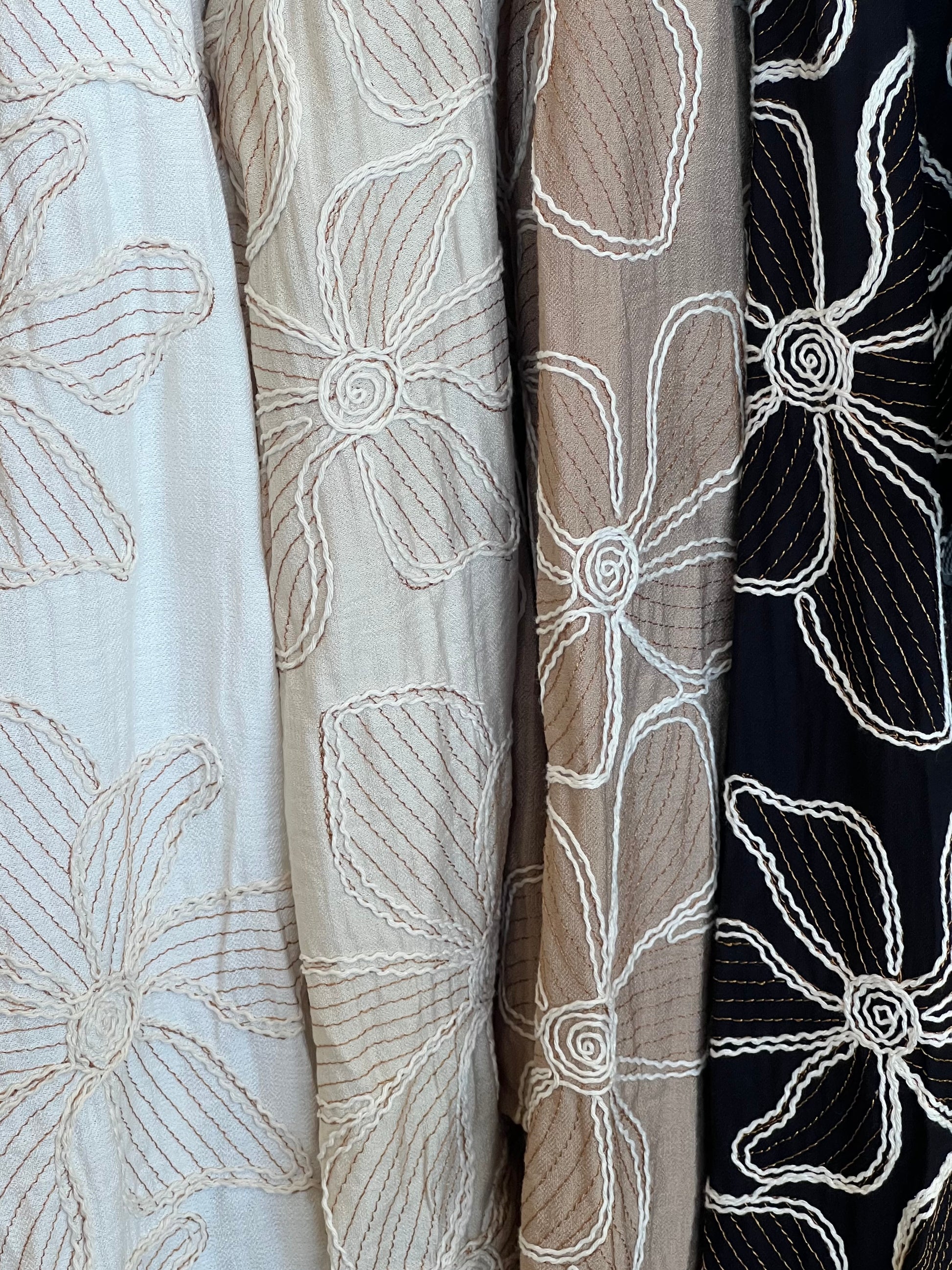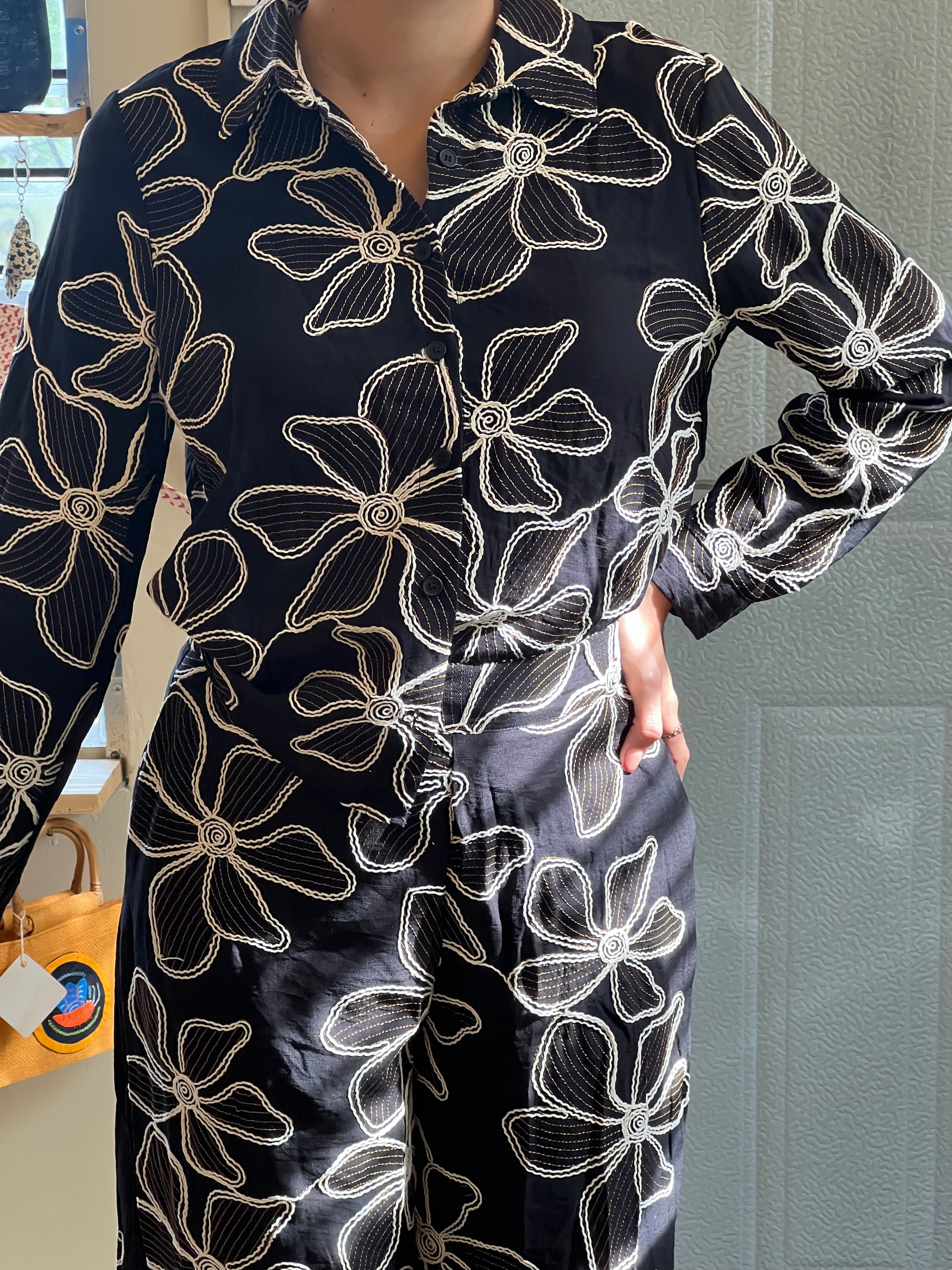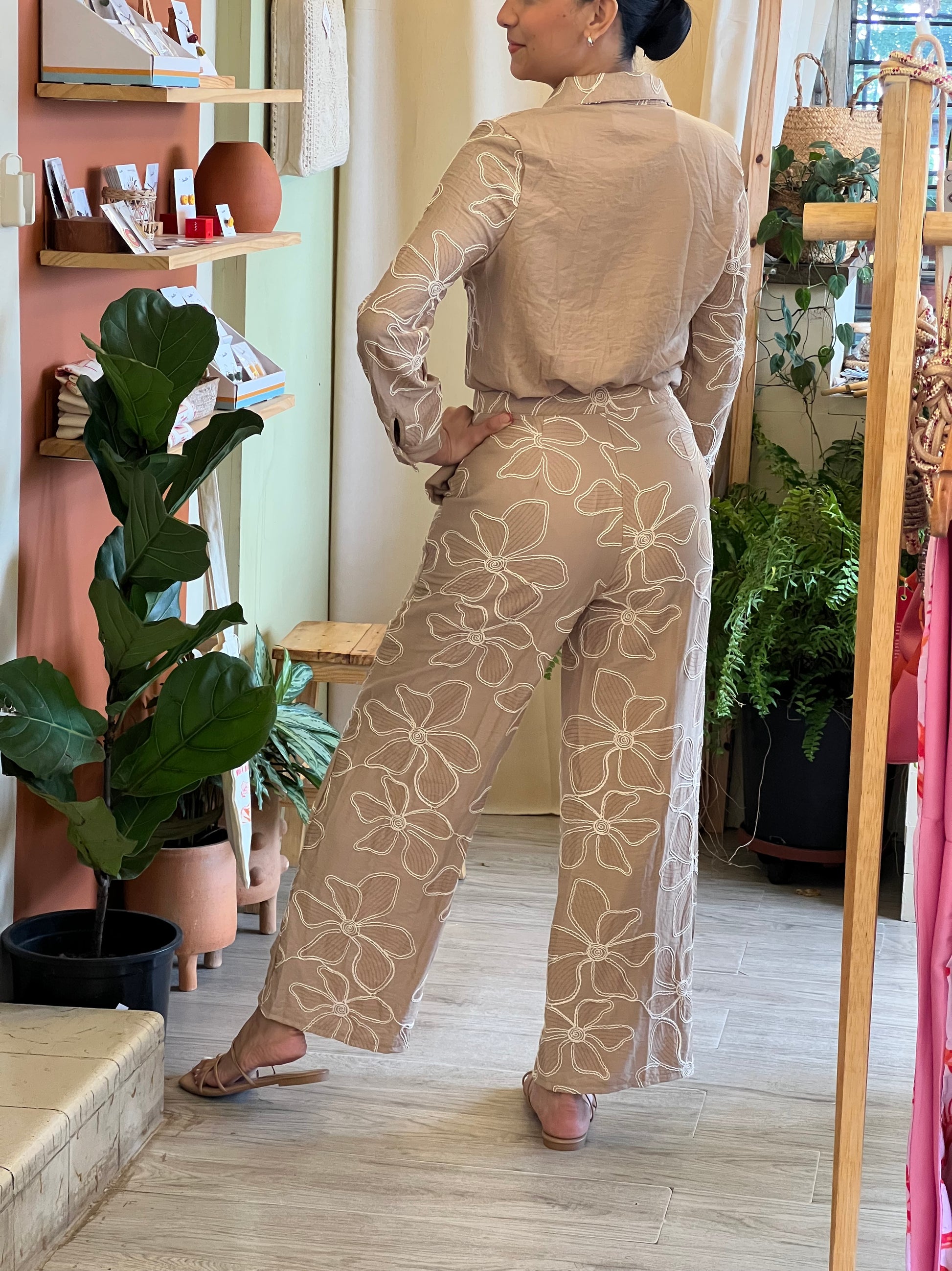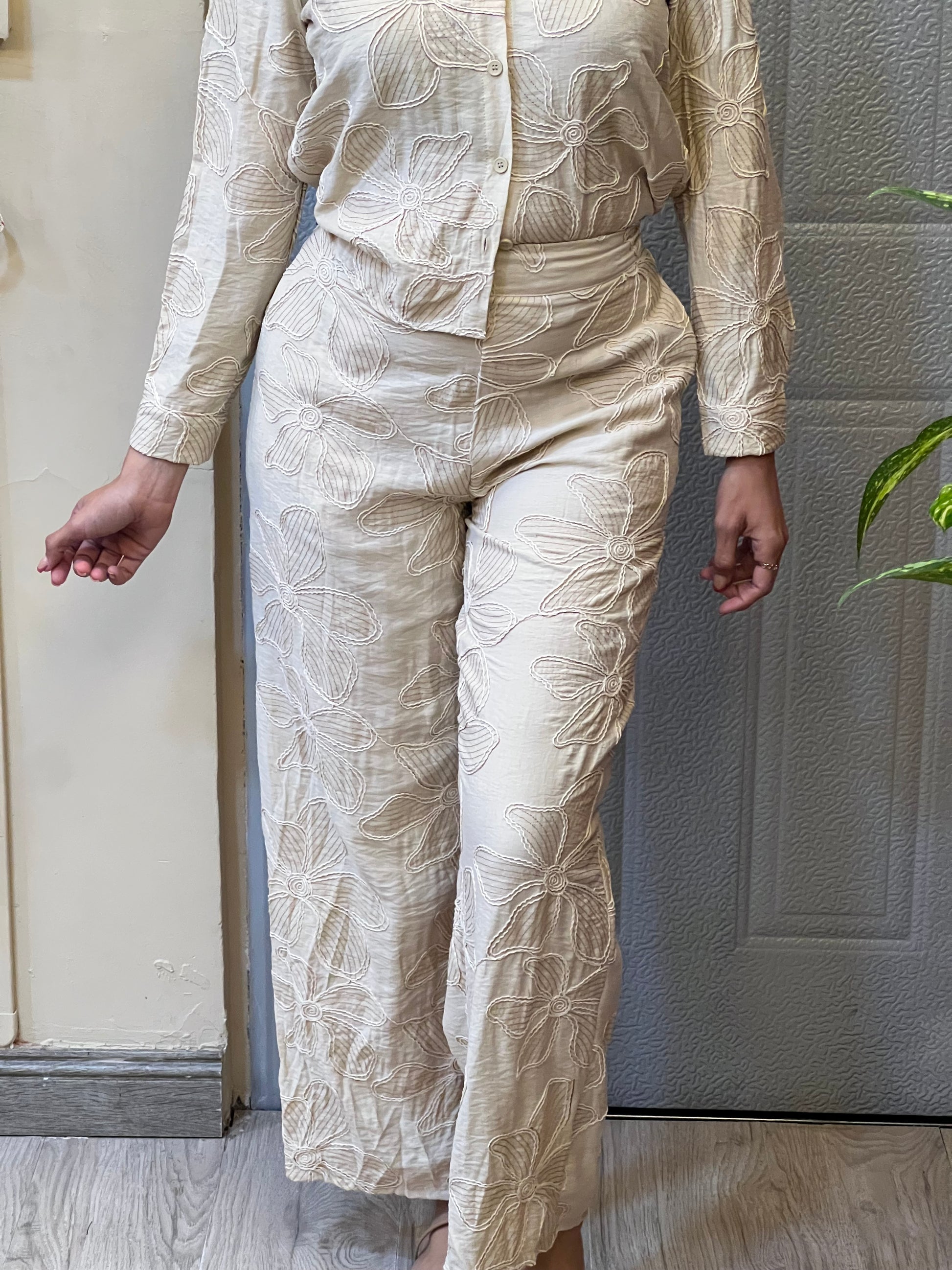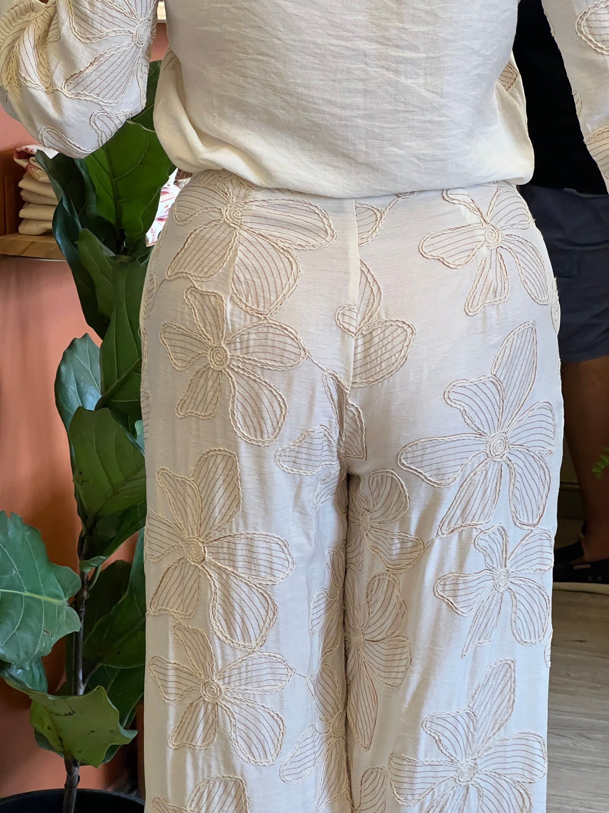 Este conjunto de pantalón y blusa de manga larga es la combinación perfecta de elegancia y frescura. Confeccionado en tela ligera y decorado con un bordado floral en relieve, aporta un estilo sofisticado sin perder la comodidad que necesitas para tu día a día.
