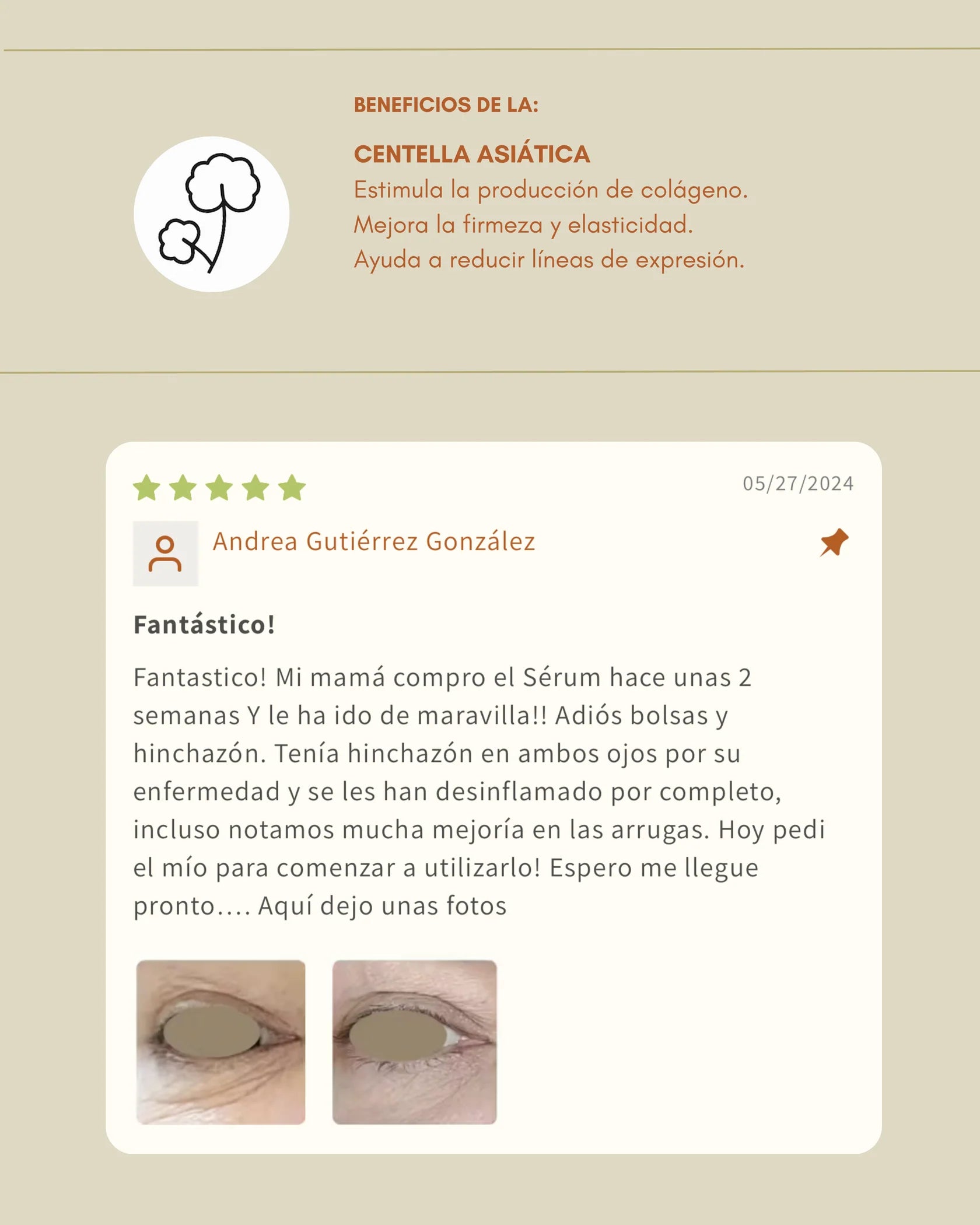 • Gracias a su gran contenido de Centella Asiatica, reduce "patas de gallo" o líneas de expresion, manteniendo el area tonificada y tersa a la vez ayudando a aumentar el colágeno.